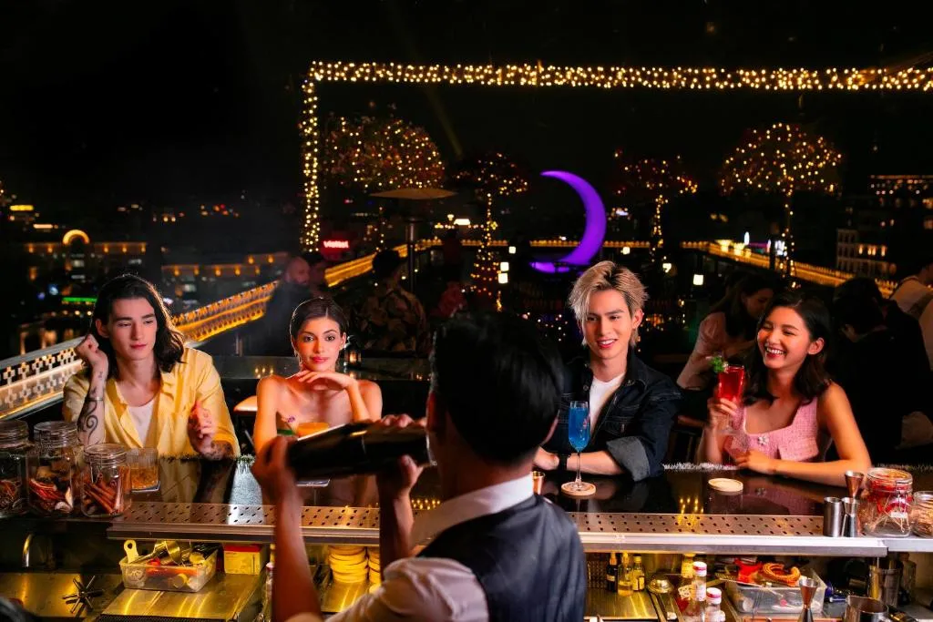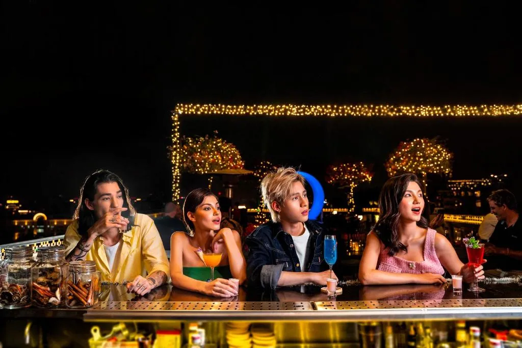 Comet Restaurant on upper floors serves a breakfast buffet and Vietnamese/Western dishes, with a vibrant rooftop Starlight Sky Bar offering panoramic Old Quarter views.