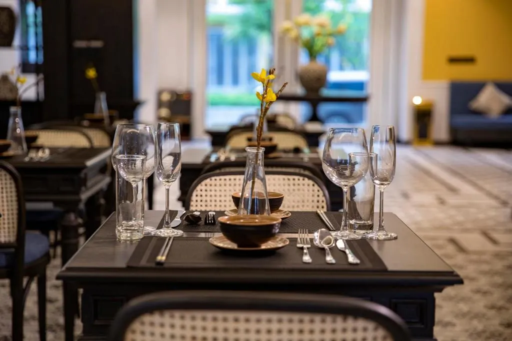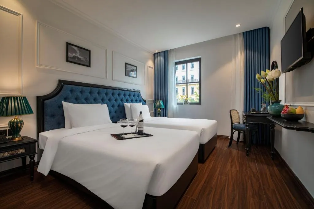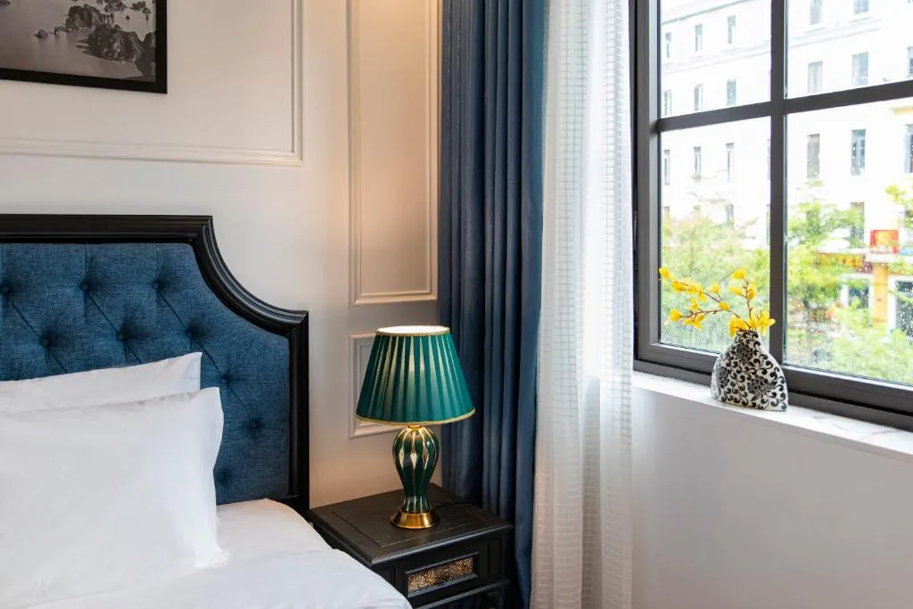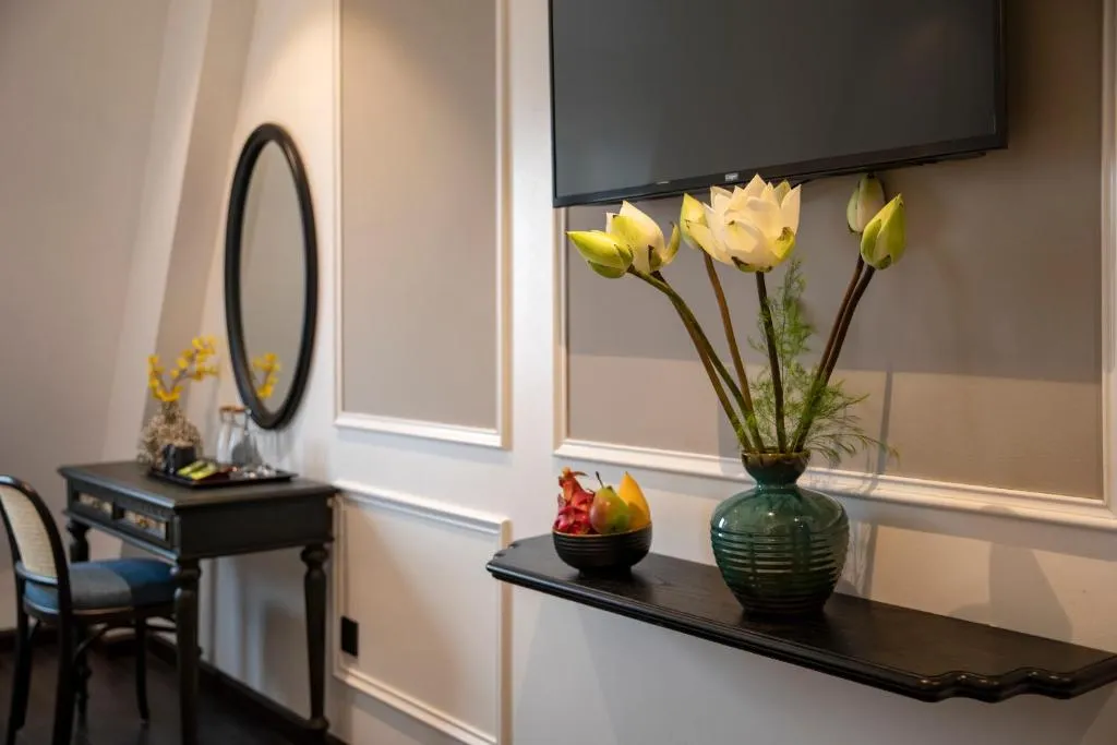 A boutique-scale 3★ hotel with around 35–36 thoughtfully styled rooms in a mid-rise building. The design mixes Indochine motifs, wooden floors, and eclectic lighting to evoke local character.