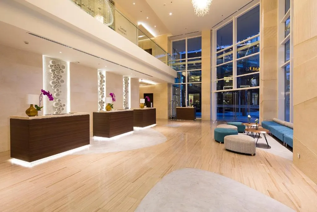 The hotel features approximately 227 modern rooms with various categories: Deluxe, Premier Ocean View, Executive, and high-end Suites. Many rooms have floor-to-ceiling windows with stunning sea or city views. All are equipped with air conditioning, flat-screen TV, minibar, safe, and elegant bathrooms.