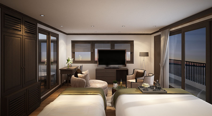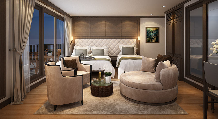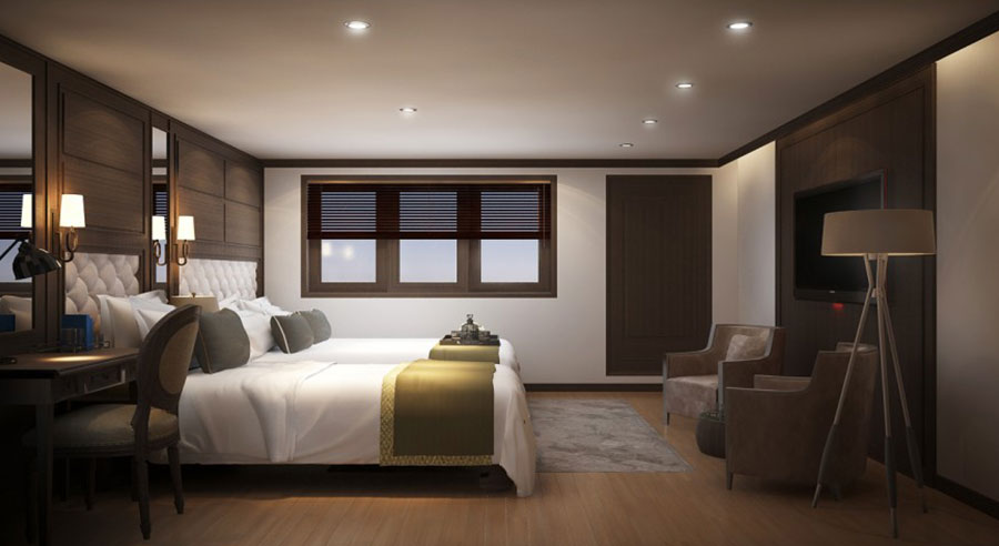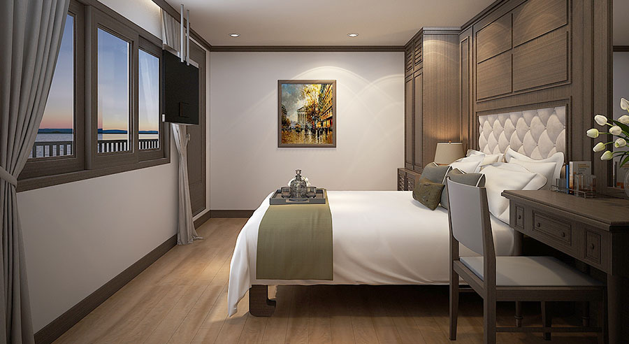Each cabin onboard Alisa Premier is tastefully decorated, blending modern comfort with classic maritime charm. Accommodating up to three guests, these rooms are ideal for couples, small families, or friends seeking an immersive Halong Bay experience.