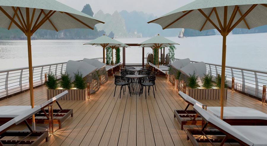 Guests staying on the second floor enjoy a special highlight: private balconies with sweeping, bird’s-eye views of the bay. From sunrise to sunset, these vantage points offer some of the most mesmerizing scenery in Halong.