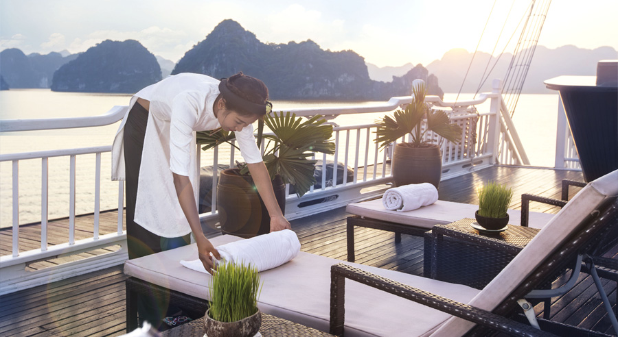 Stepping onto Aphrodite Cruise is like embarking on a graceful voyage alongside the Goddess of Beauty herself. From the moment the ship sets sail across the emerald waters of Halong Bay, guests are invited to immerse themselves in serenity, luxury, and unforgettable moments that define a truly exceptional cruise experience.
