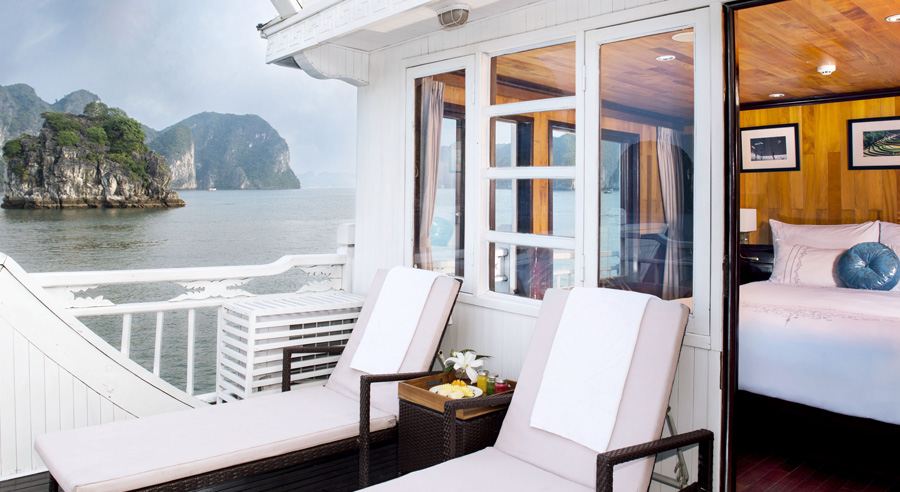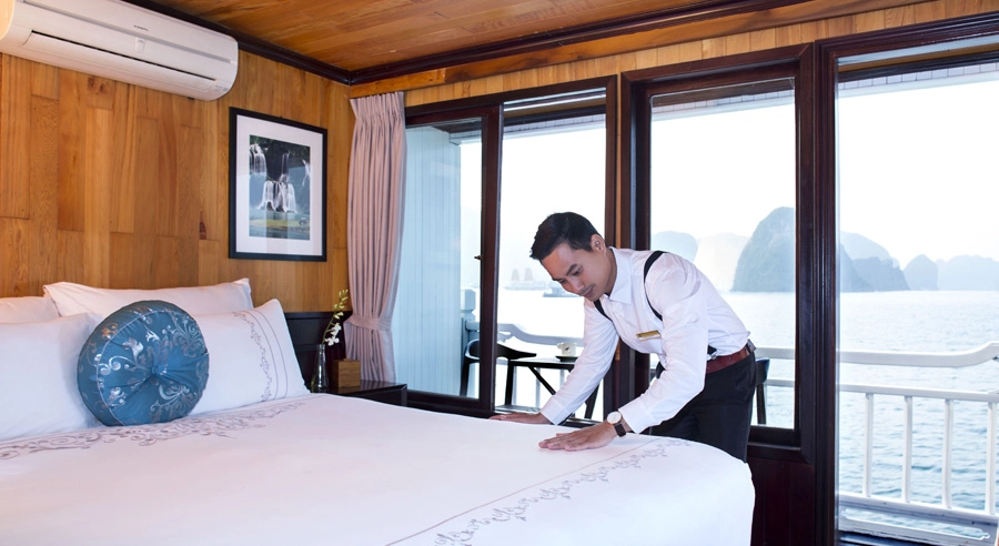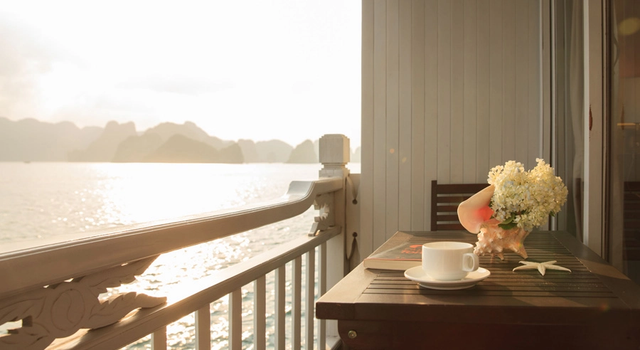 Aphrodite Cruise offers two main cabin categories: Luxury Cabin and Suite Cabin, each thoughtfully designed with multiple sub-options to suit different preferences. Guests can choose between Standard or Balcony Luxury Cabins, as well as Standard or Terrace Suites, all showcasing a harmonious blend of traditional Vietnamese aesthetics and modern comfort. Warm wooden interiors, elegant décor inspired by ancient Vietnamese culture, and carefully selected furnishings create a welcoming and sophisticated ambiance.