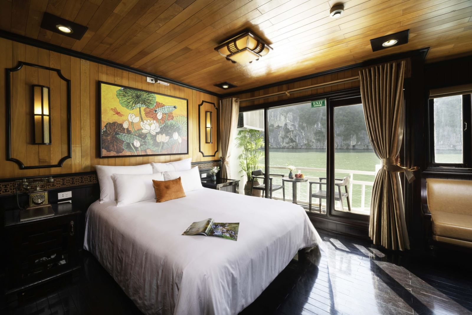 Arcady Boutique Cruise features 24 thoughtfully designed cabins, all equipped with en-suite bathrooms and a private sea-facing balcony—ideal spaces to unwind, breathe in the ocean breeze, and admire the breathtaking limestone landscapes of Ha Long Bay.