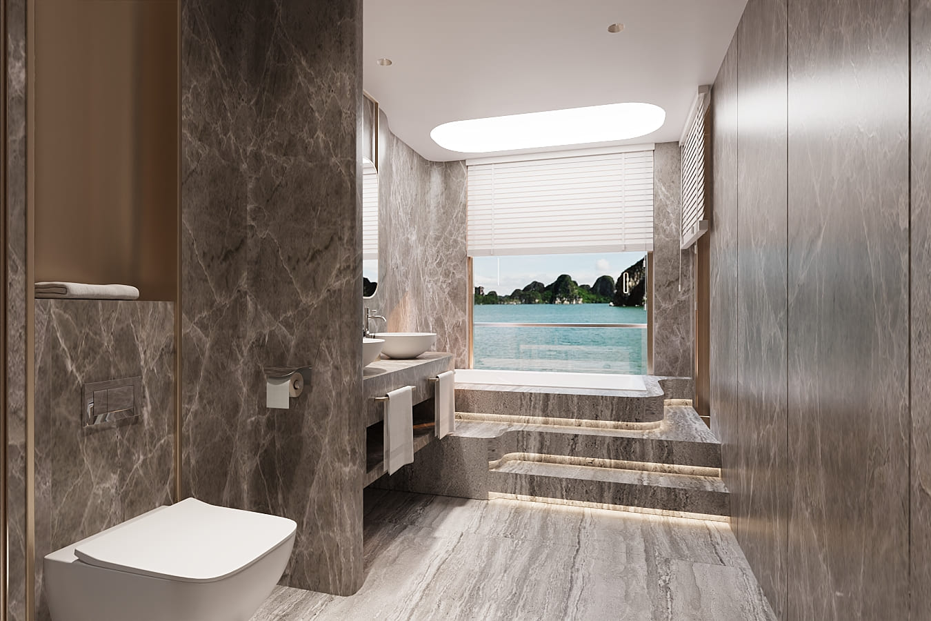 Athena Premium Cruise features 41 luxurious suites, each thoughtfully crafted to elevate the onboard living experience. All suites boast full-glass sea-view balconies, allowing uninterrupted views of Halong Bay’s iconic limestone karsts. Interiors are enhanced with luxurious bathtubs, standing showers, elegant dressing tables, and advanced soundproofing systems, ensuring both privacy and comfort. Selected suite categories offer private jacuzzi or onsen baths, dedicated butler service, and exclusive premium amenities, catering to guests who desire the highest level of personalized luxury.