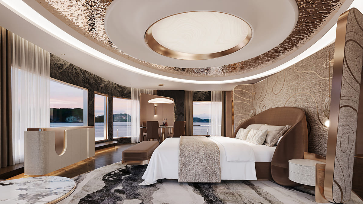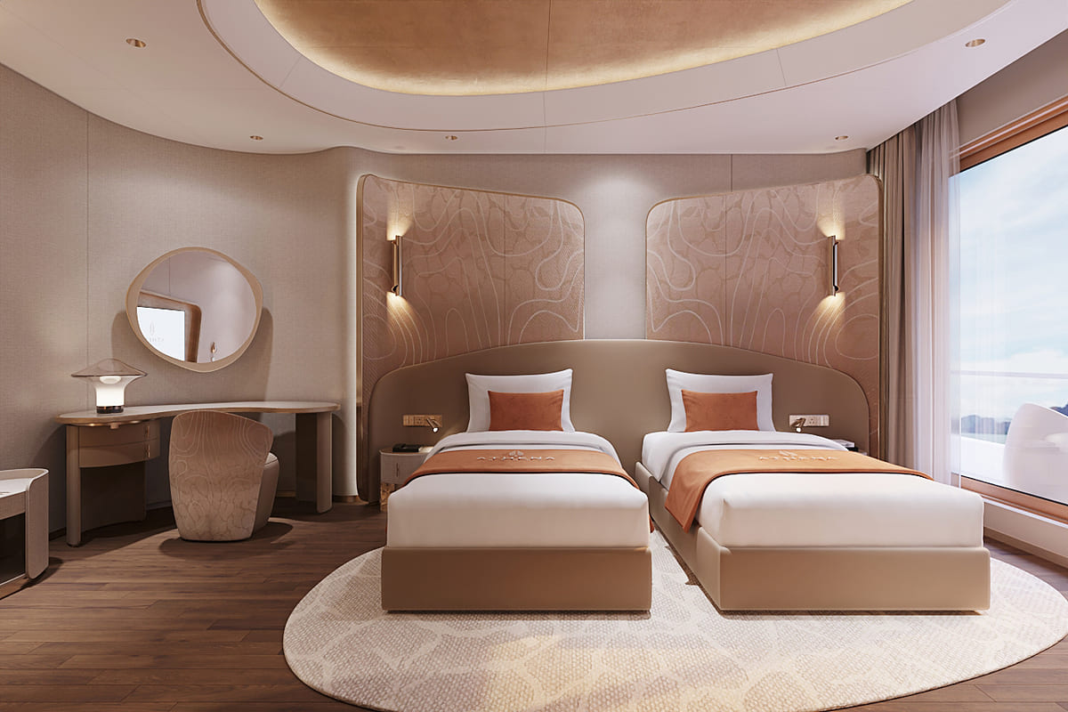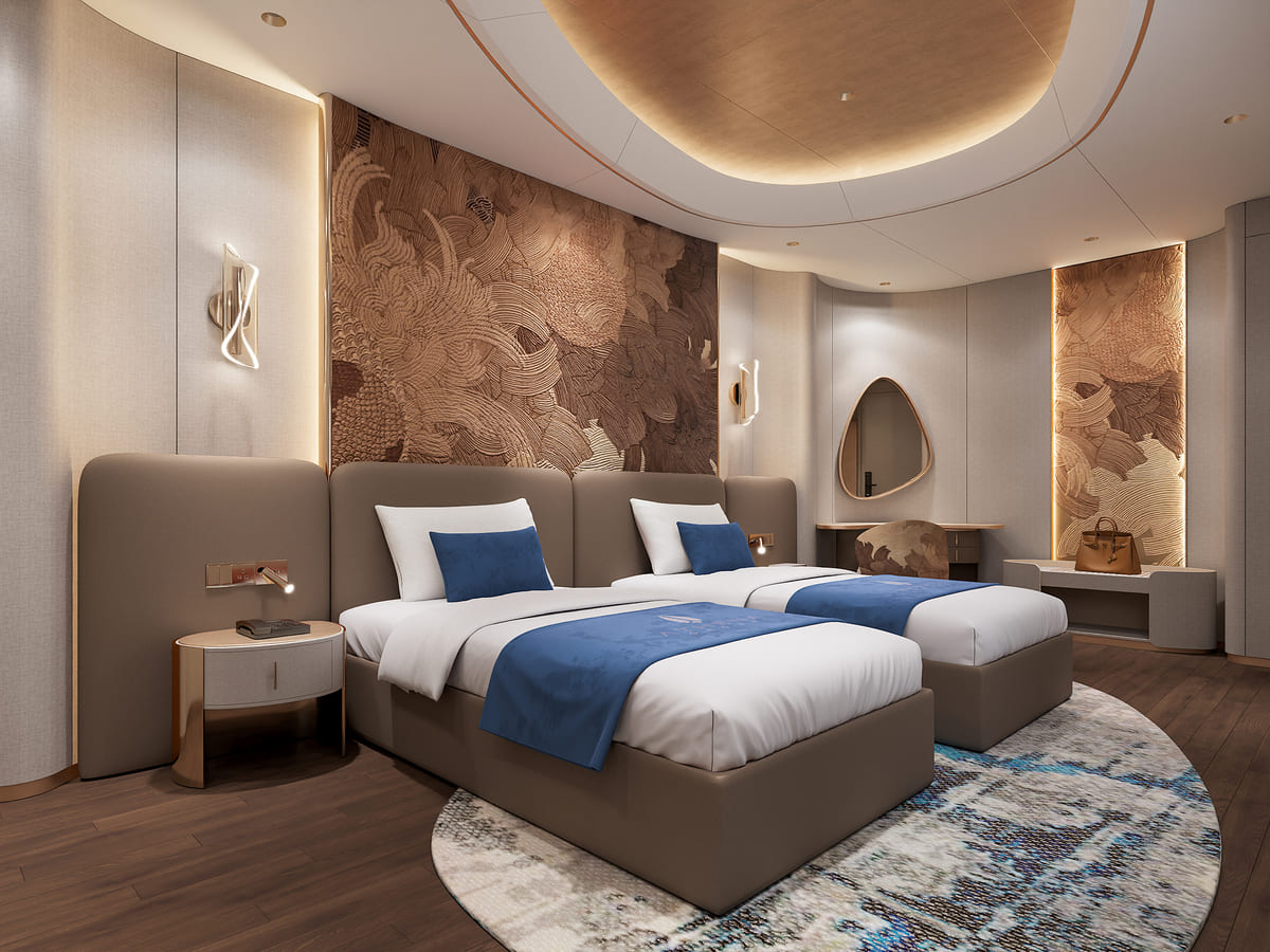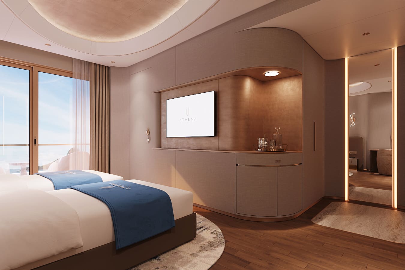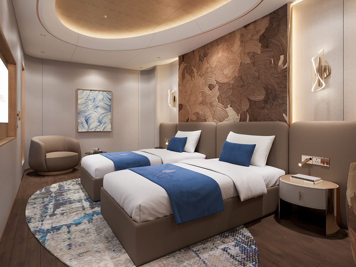 Beyond accommodation, Athena Premium delivers a truly multi-sensory journey where relaxation and entertainment are perfectly balanced. Guests can indulge in an impressive range of high-end facilities, including fine-dining restaurants, a luxury bar, a four-season swimming pool, a 3D golf course, onsen mineral baths, yoga and meditation rooms, sauna, and a sky observation lounge—all designed to enrich every moment on board.