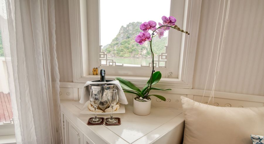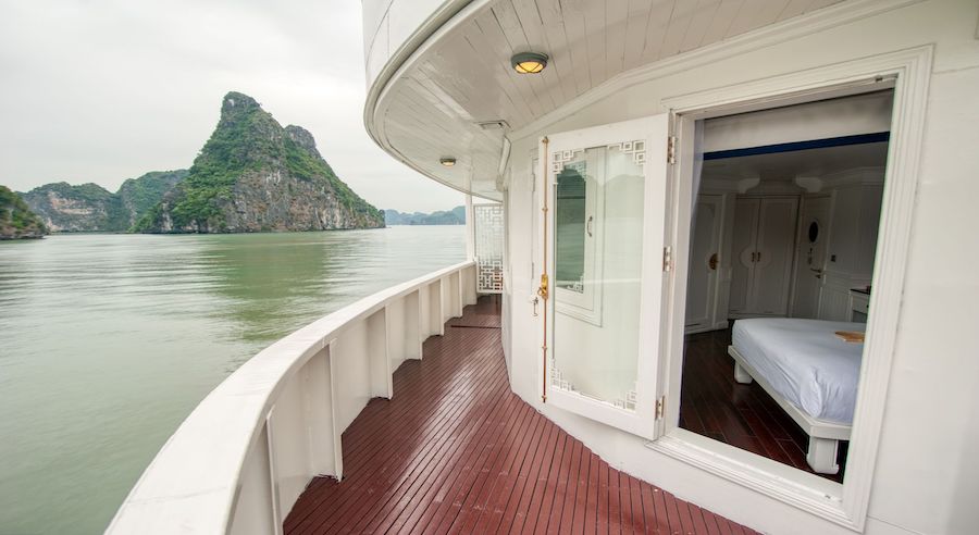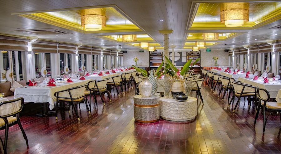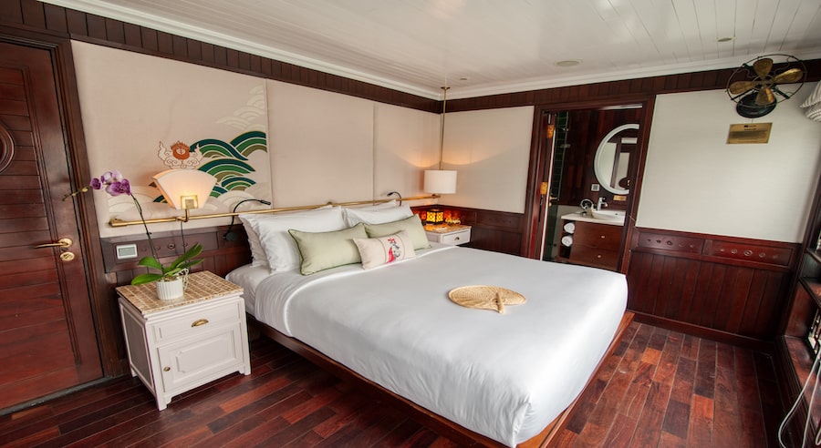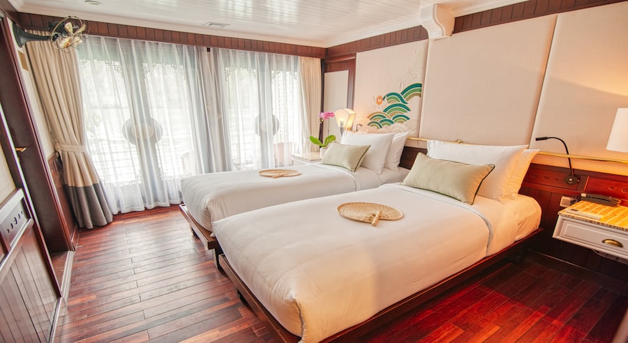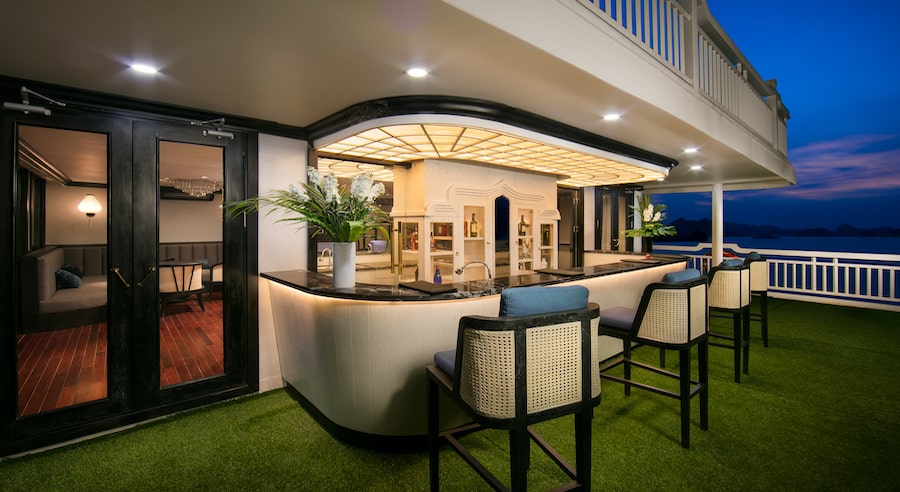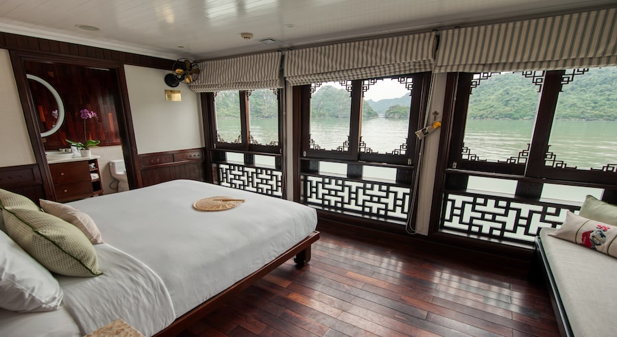 The cruise features 32 elegantly designed cabins across five categories: Deluxe, Grand Deluxe, Executive, Long Quan, and Au Co Suite. All cabins are equipped with floor-to-ceiling windows, glass doors, timber flooring, and private balconies, offering panoramic bay views and a relaxing private space filled with natural light and fresh air.