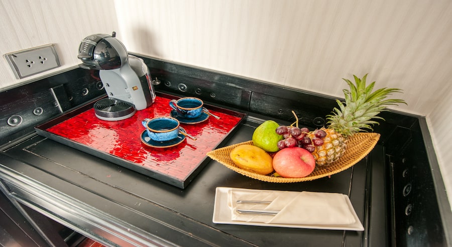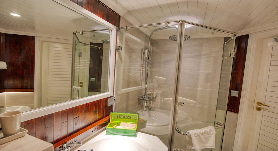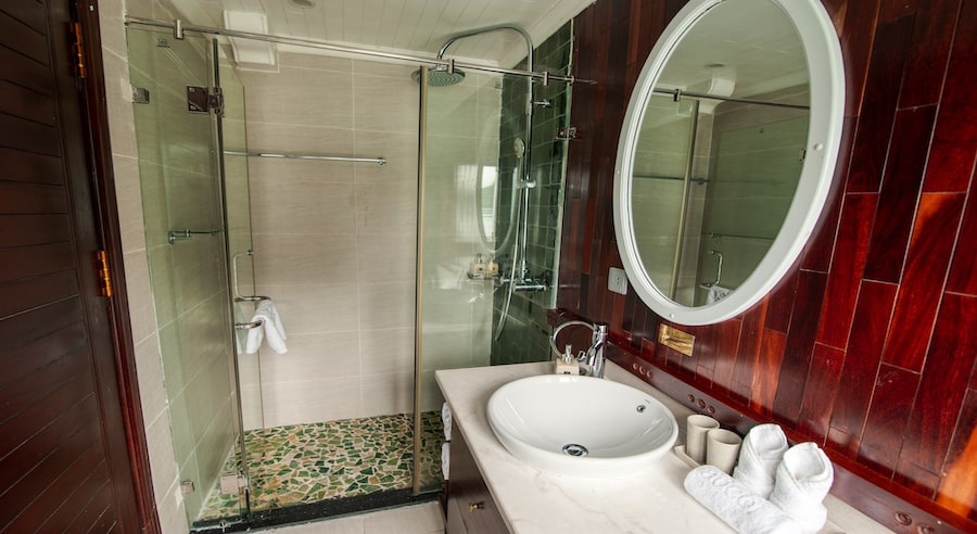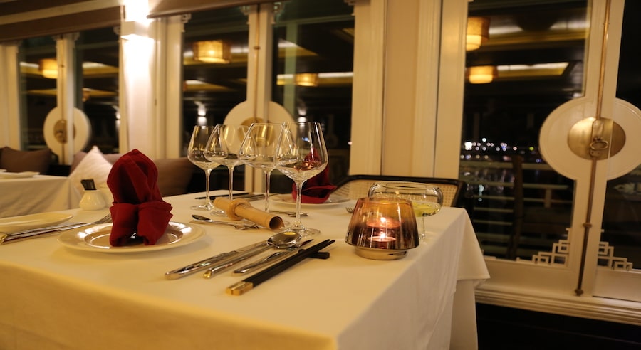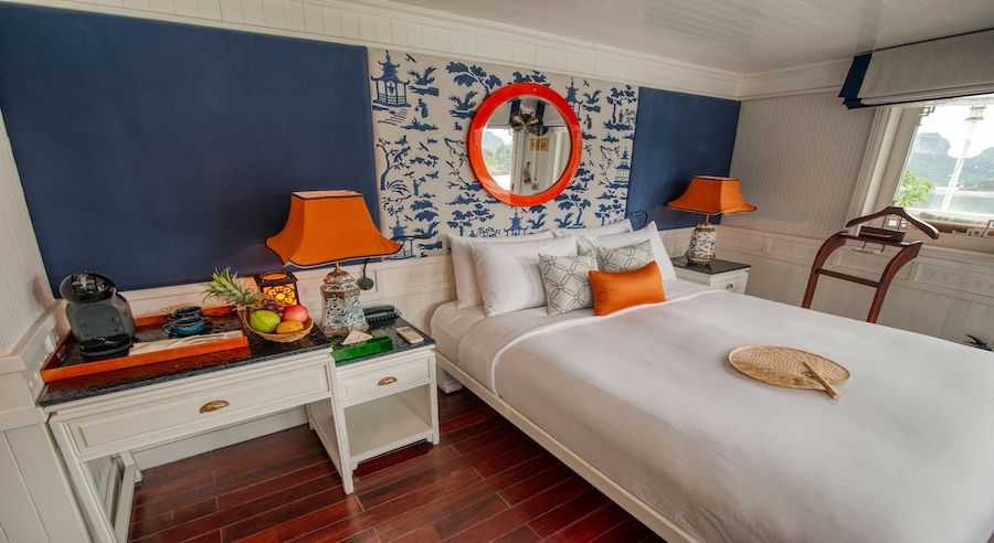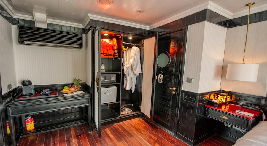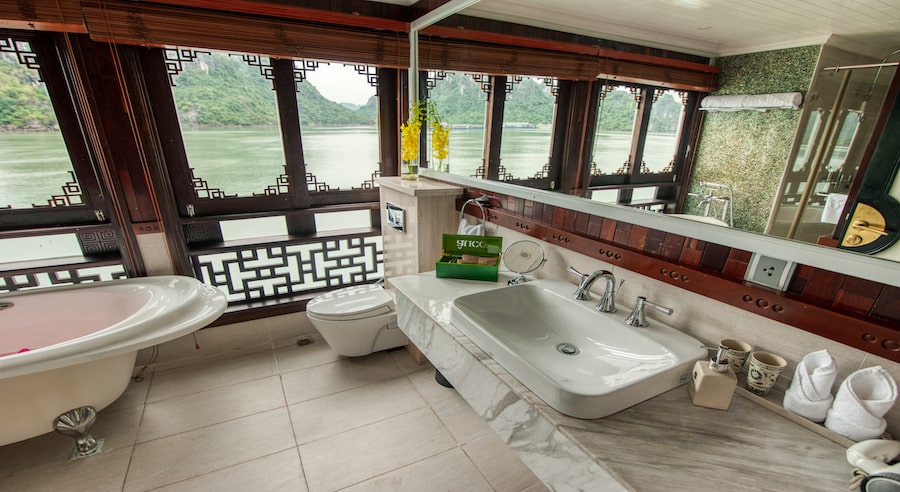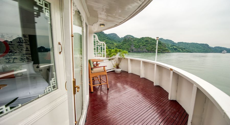 The cruise features 32 elegantly designed cabins across five categories: Deluxe, Grand Deluxe, Executive, Long Quan, and Au Co Suite. All cabins are equipped with floor-to-ceiling windows, glass doors, timber flooring, and private balconies, offering panoramic bay views and a relaxing private space filled with natural light and fresh air.