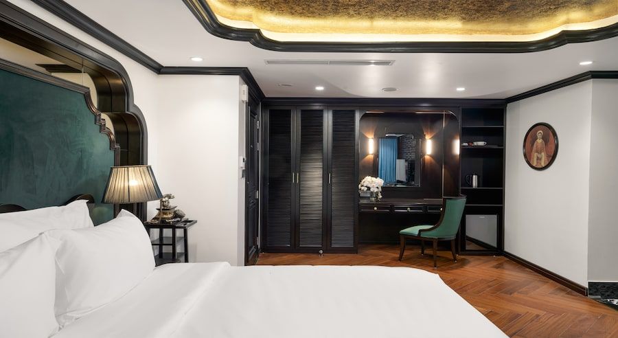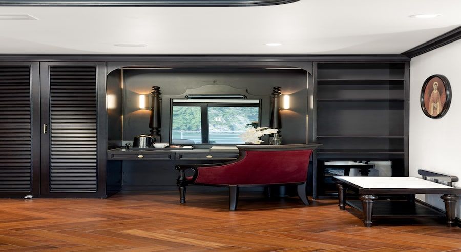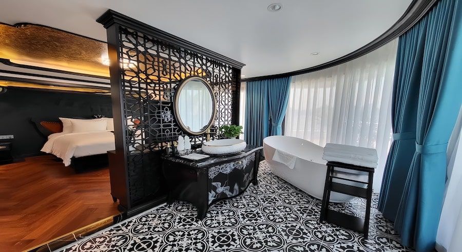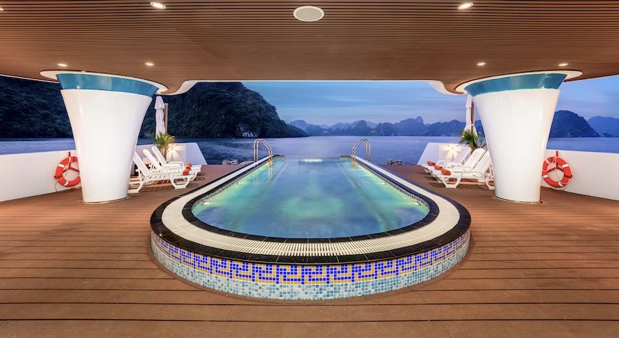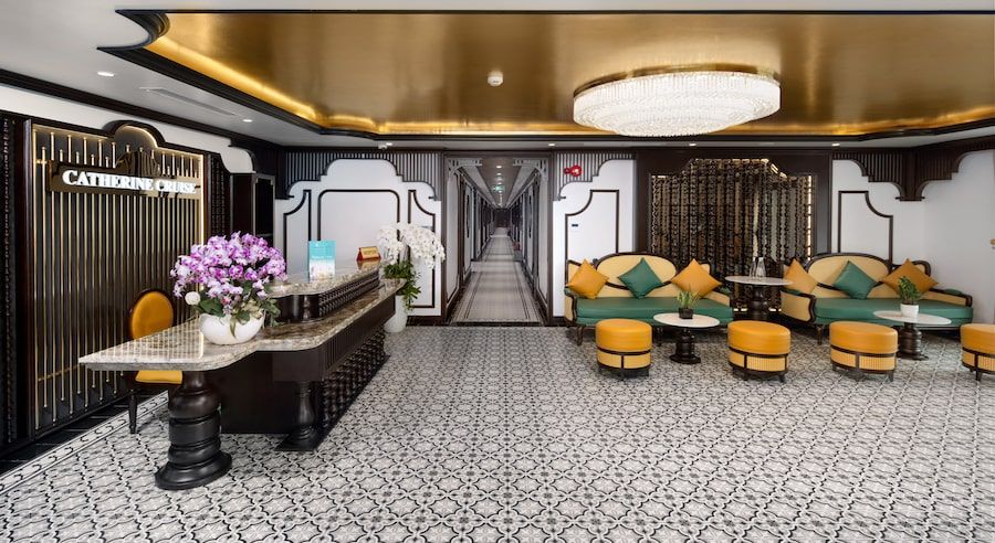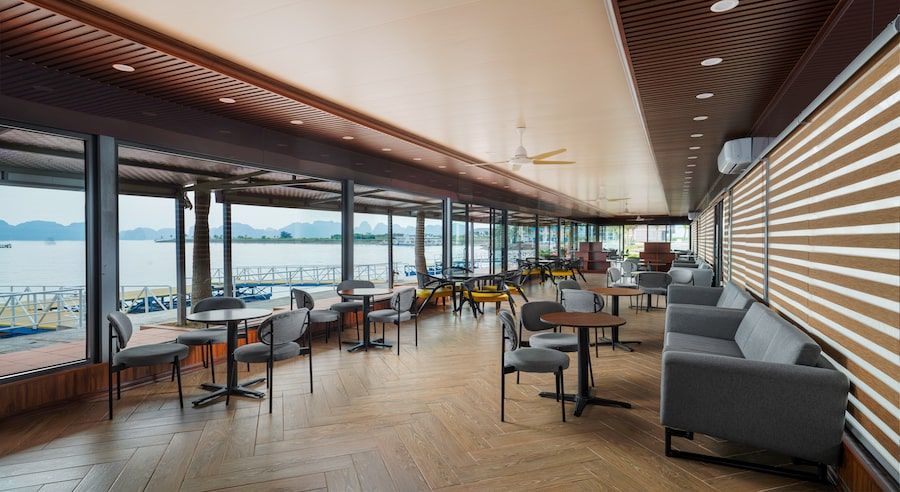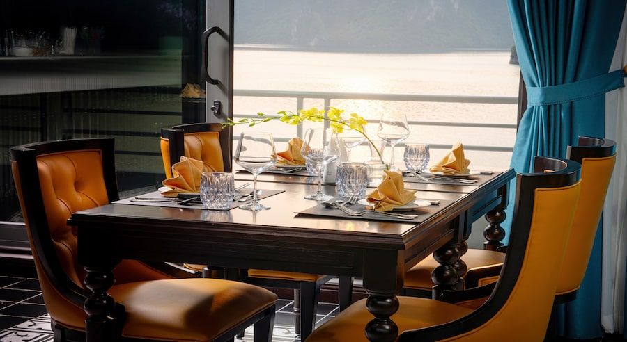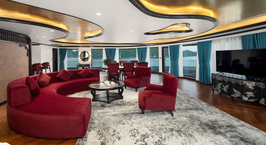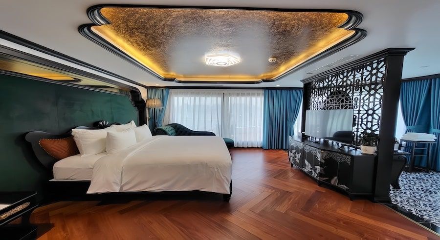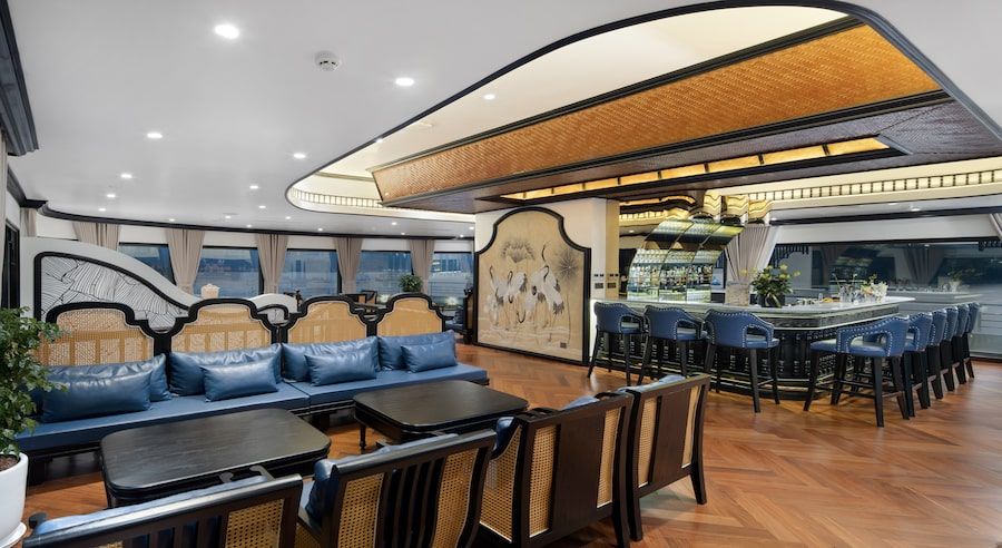 The cruise features 39 spacious luxury cabins, ranging from 40m² to 200m² and accommodating up to 117 guests—an ideal choice for couples, families, groups, or corporate travelers. Inspired by elegant Indochine architecture, each cabin is beautifully decorated with refined patterns and tasteful furnishings. Together with the poetic bay views, the atmosphere feels both luxurious and warmly inviting.
