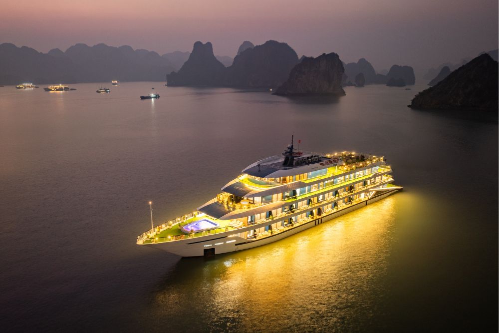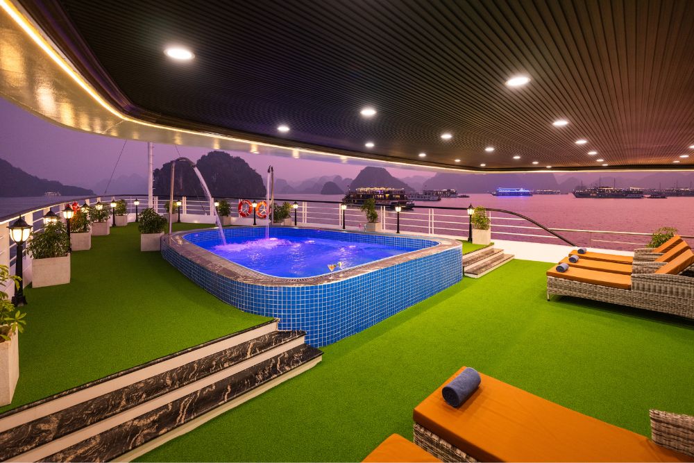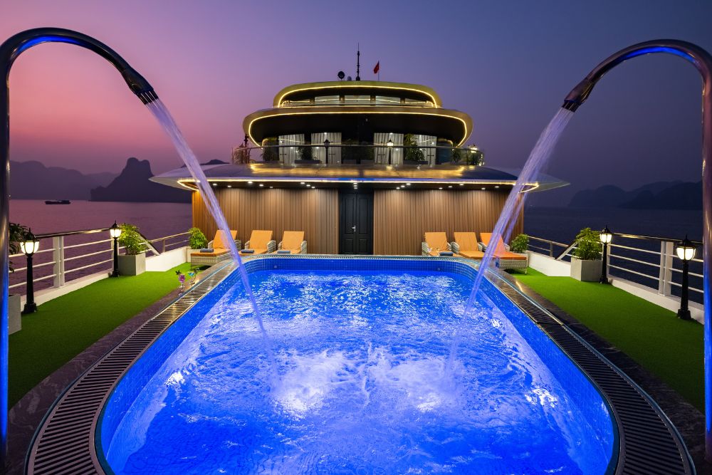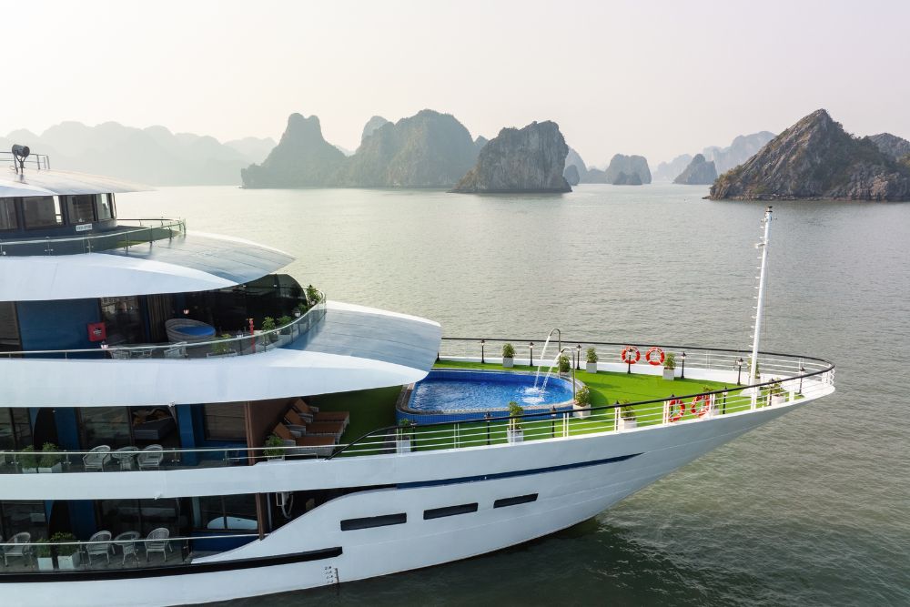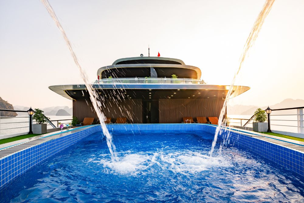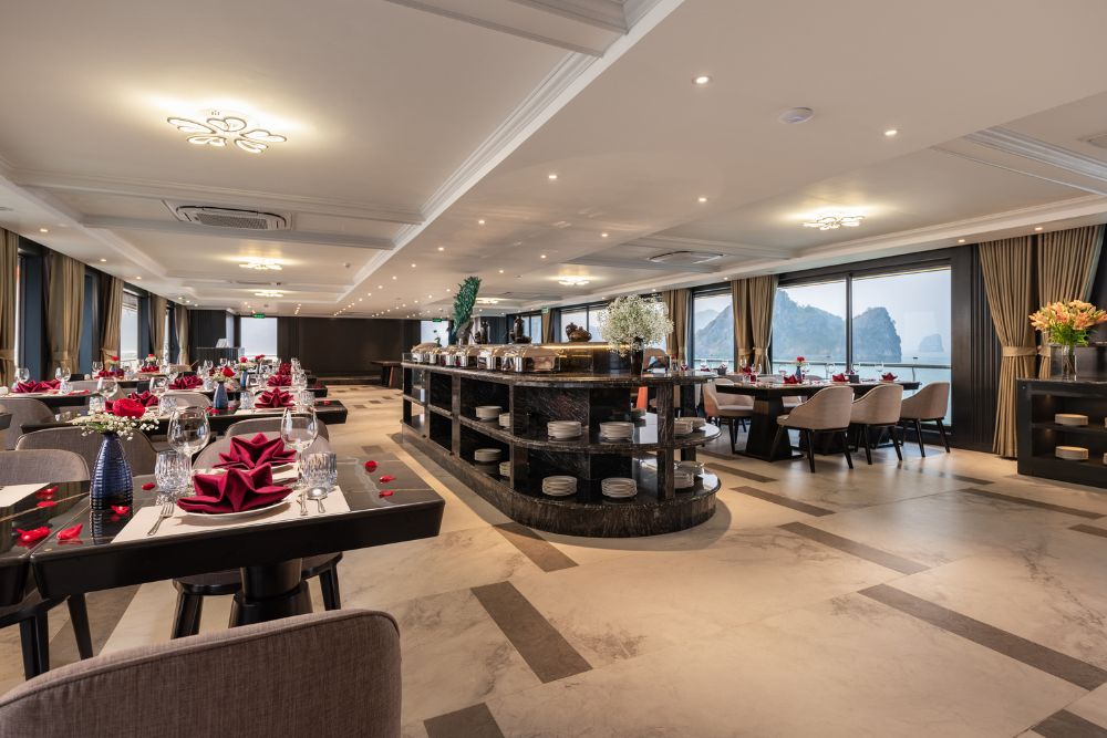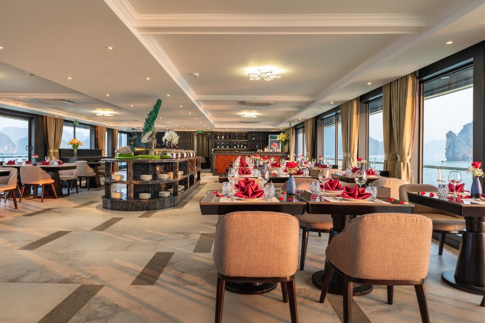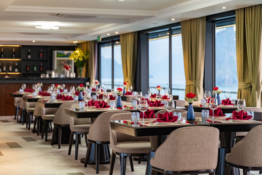 The cruise features 25 balcony cabins, all equipped with modern amenities and panoramic views of Lan Ha Bay, day and night. Guests can enjoy premium onboard facilities such as a four-season swimming pool, sky bar, and luxury spa, ensuring a relaxing stay throughout the journey. The onboard restaurant serves a variety of Vietnamese and international cuisine, with flexible options for vegetarian, vegan, gluten-free, and non-seafood diets upon request.