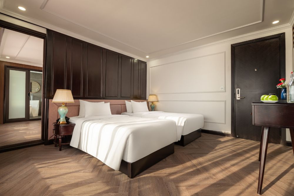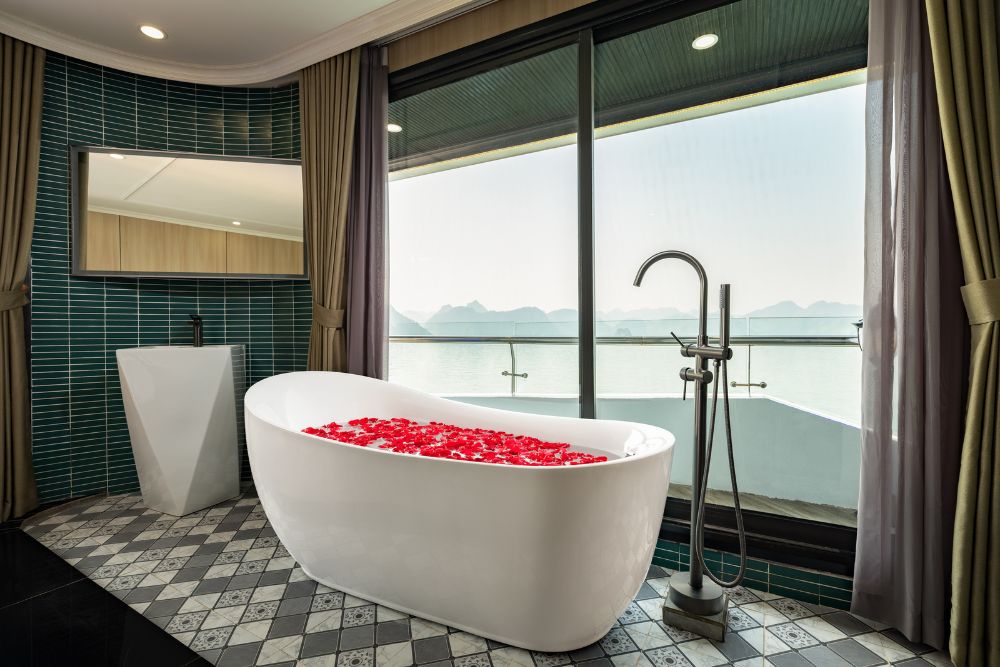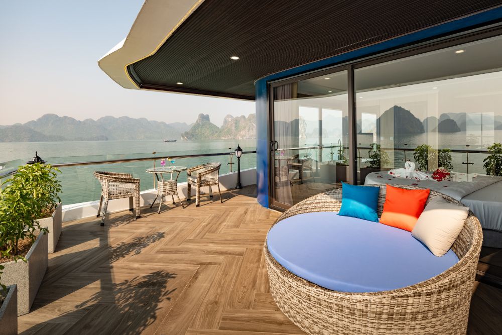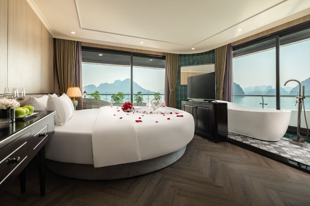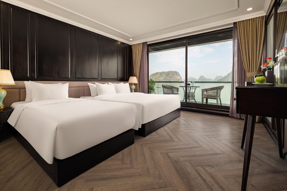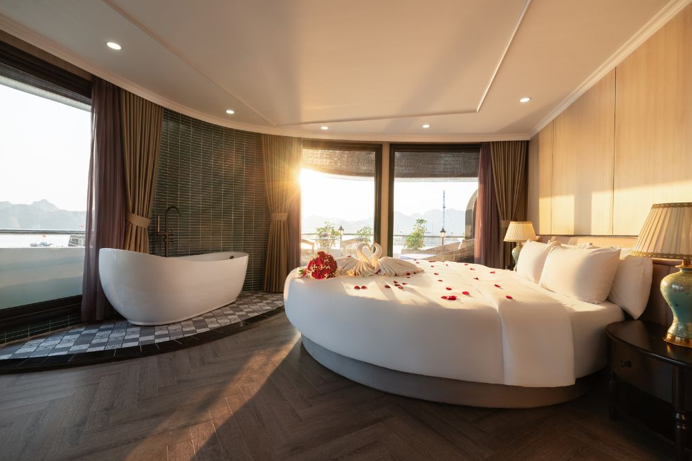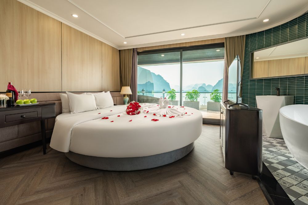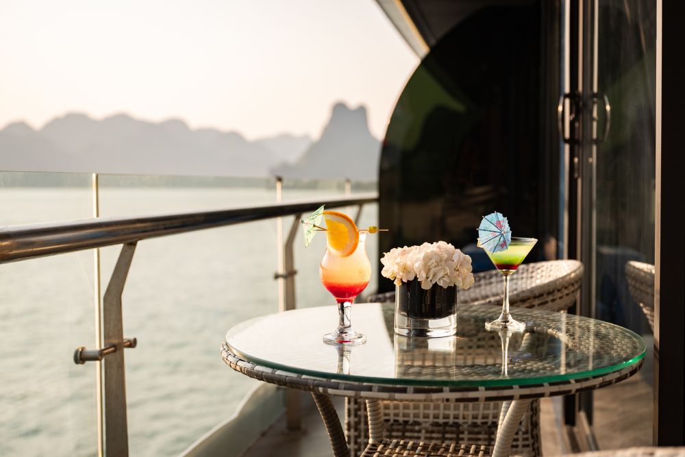 The cruise features 25 balcony cabins, all equipped with modern amenities and panoramic views of Lan Ha Bay, day and night. Guests can enjoy premium onboard facilities such as a four-season swimming pool, sky bar, and luxury spa, ensuring a relaxing stay throughout the journey. The onboard restaurant serves a variety of Vietnamese and international cuisine, with flexible options for vegetarian, vegan, gluten-free, and non-seafood diets upon request.