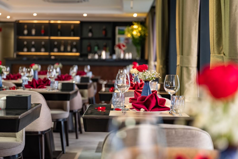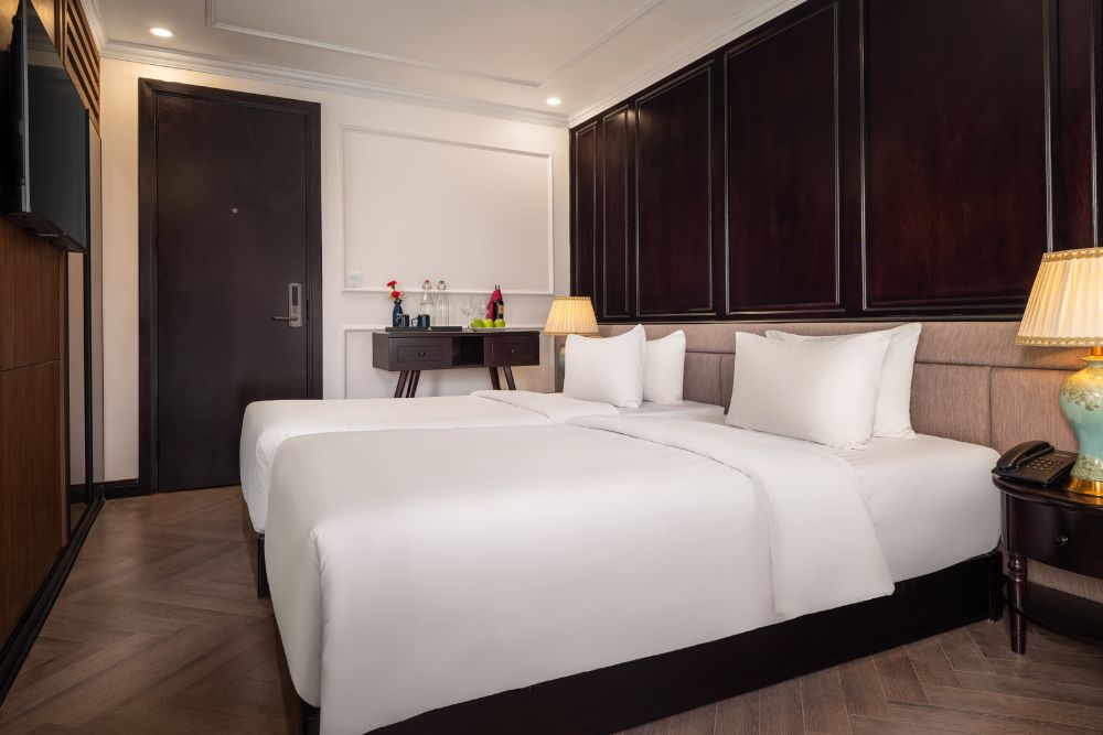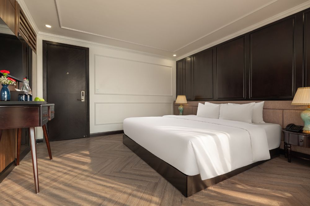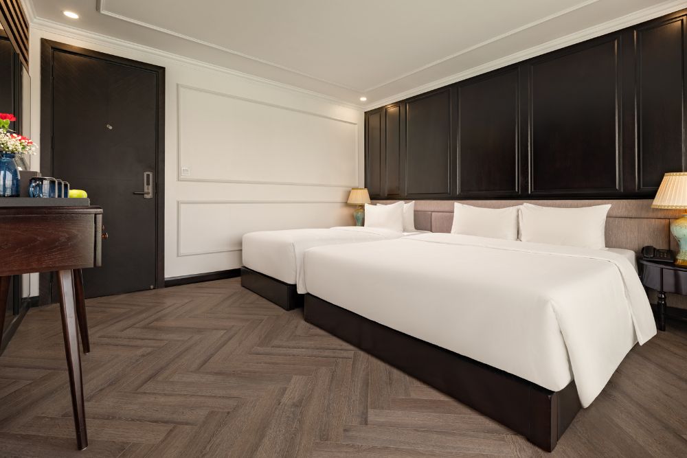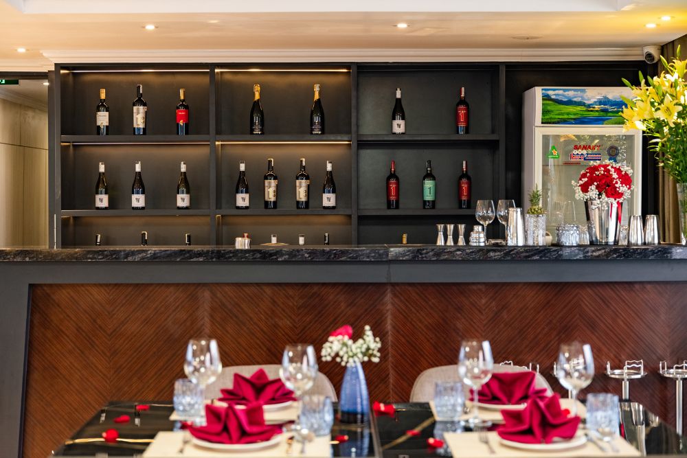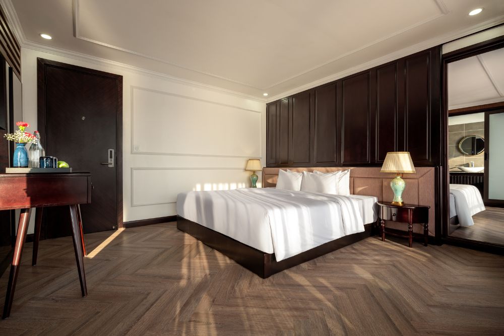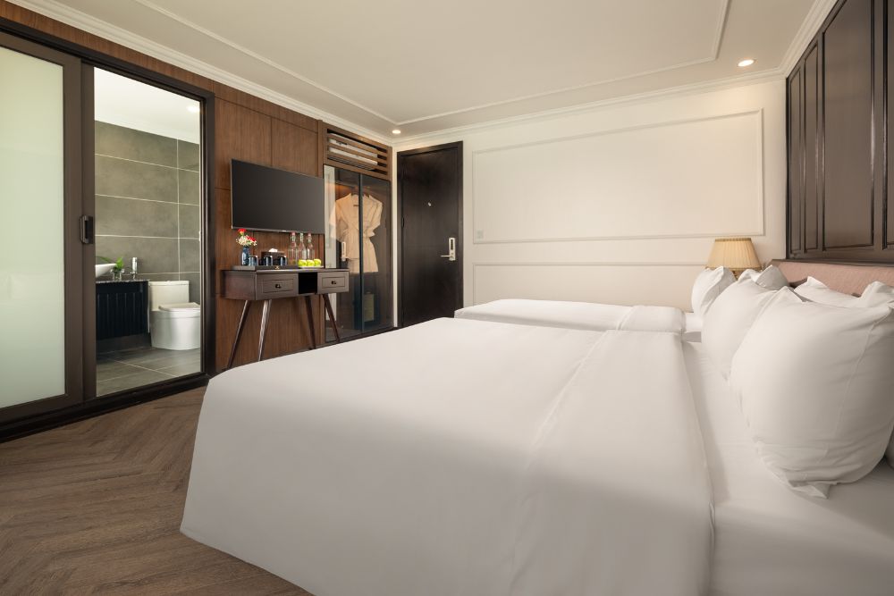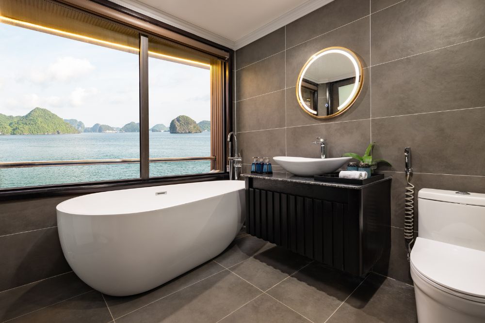 The cruise features 25 balcony cabins, all equipped with modern amenities and panoramic views of Lan Ha Bay, day and night. Guests can enjoy premium onboard facilities such as a four-season swimming pool, sky bar, and luxury spa, ensuring a relaxing stay throughout the journey. The onboard restaurant serves a variety of Vietnamese and international cuisine, with flexible options for vegetarian, vegan, gluten-free, and non-seafood diets upon request.