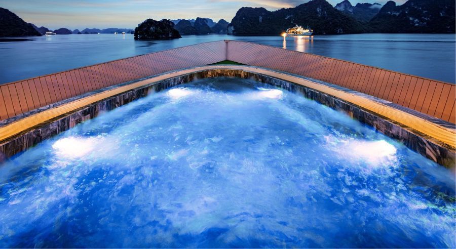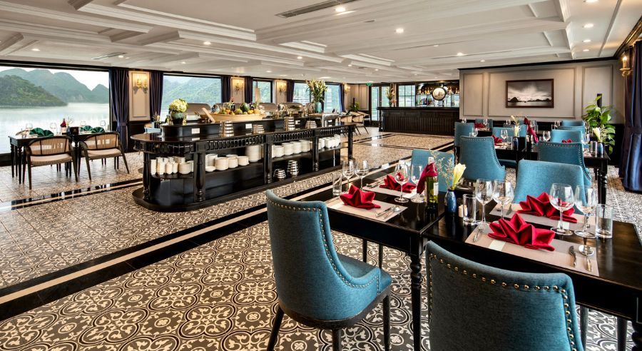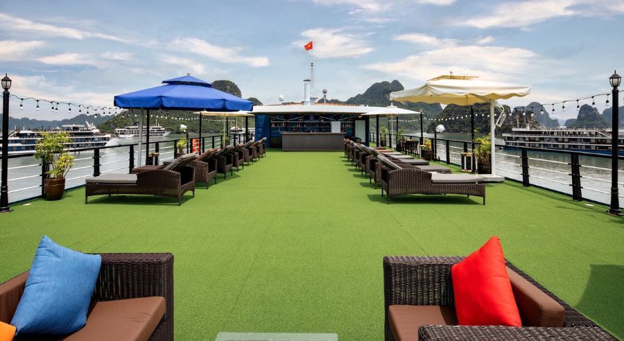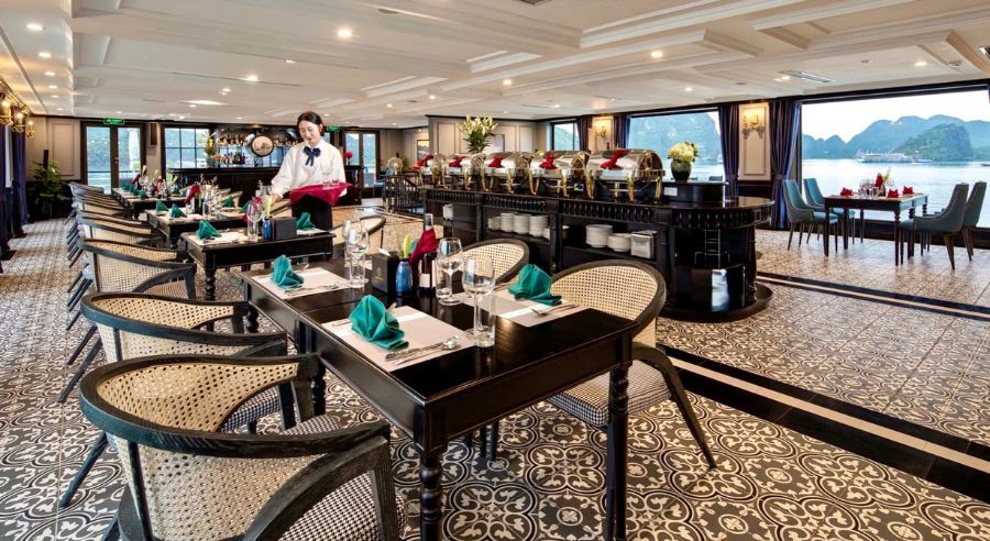 Guests can enjoy set menus or buffet meals in the spacious 350 sqm dining area on the third deck. This beautifully designed space allows travelers to savor flavorful dishes while watching the spectacular limestone scenery drift by. For sunset lovers, the sky bar on the sundeck is the perfect place to enjoy cocktails, wine, or late-night drinks beneath the stars.