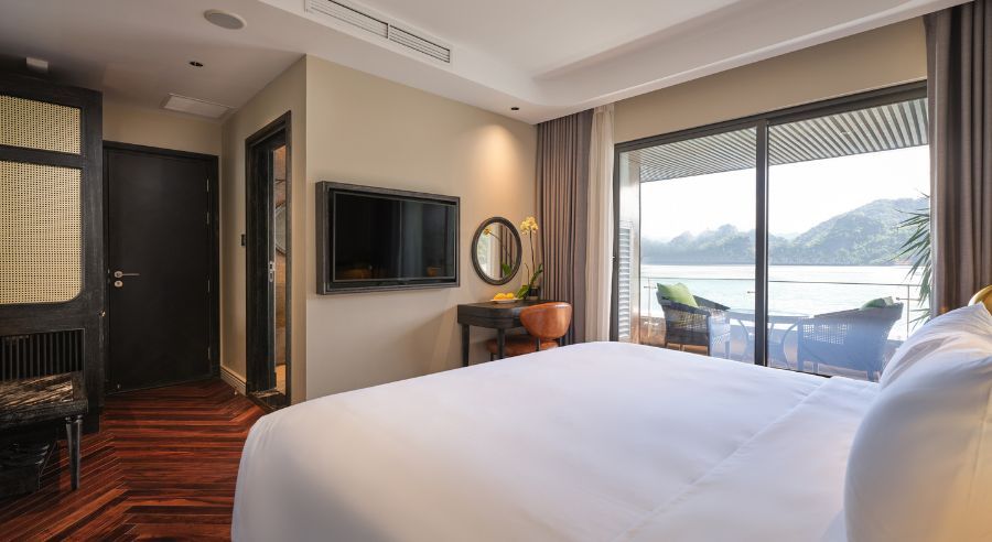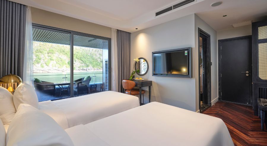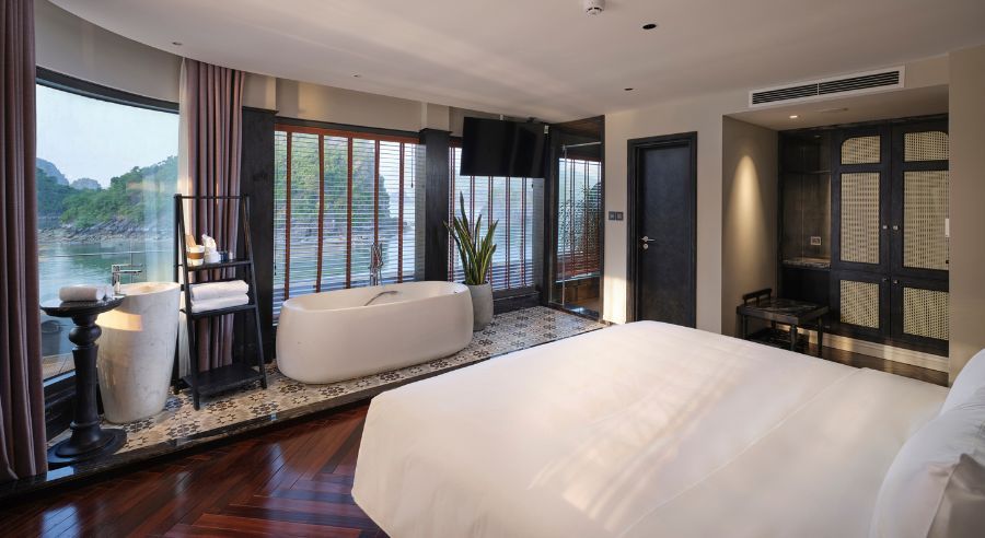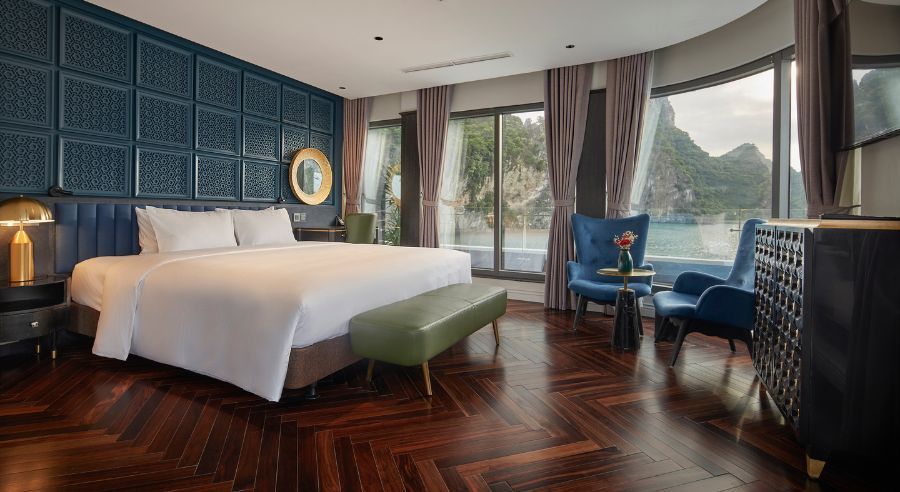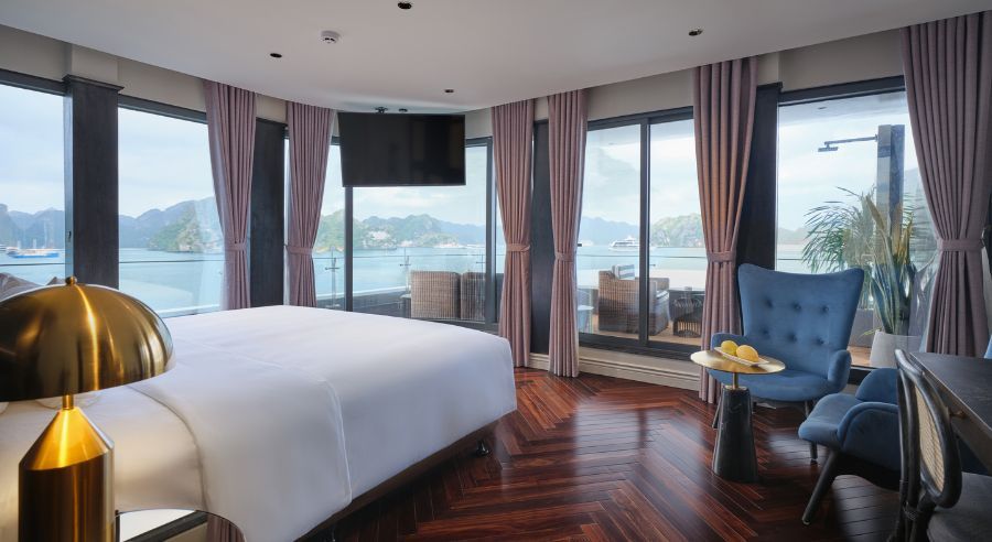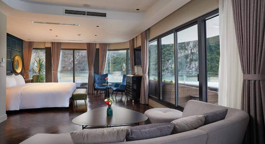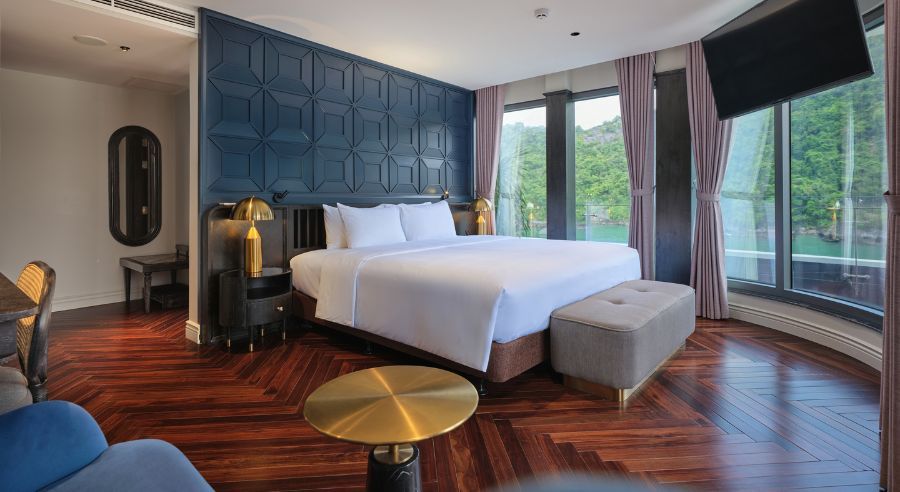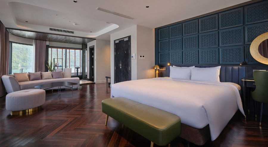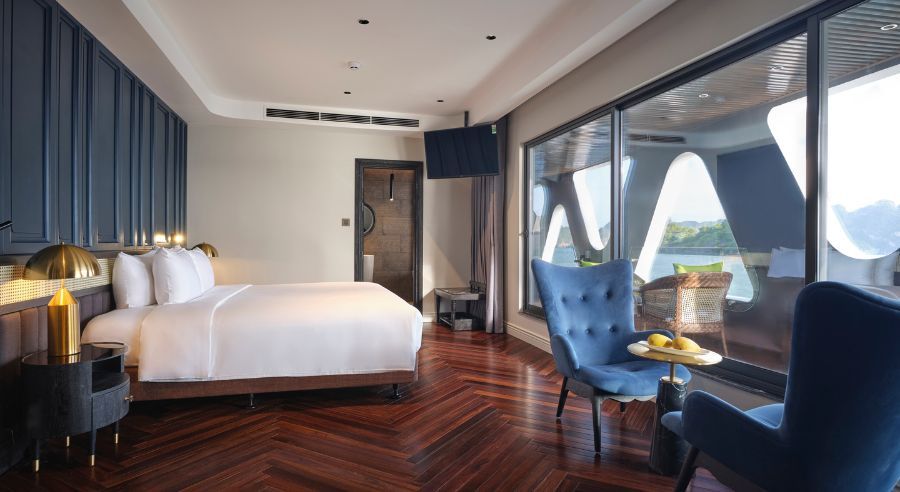 The cruise features 35 deluxe cabins across four decks, categorized into six room types: Junior, Junior Premium, Senior, Senior Premium, Executive, and the opulent President Suite. Ranging from 23 to 60 sqm, each cabin offers generous space and modern facilities including multi-zone air-conditioning, satellite TV, minibar, ocean-view bathtub, and a marble ensuite bathroom. Every detail is tailored to ensure maximum comfort and a beautifully refined stay.