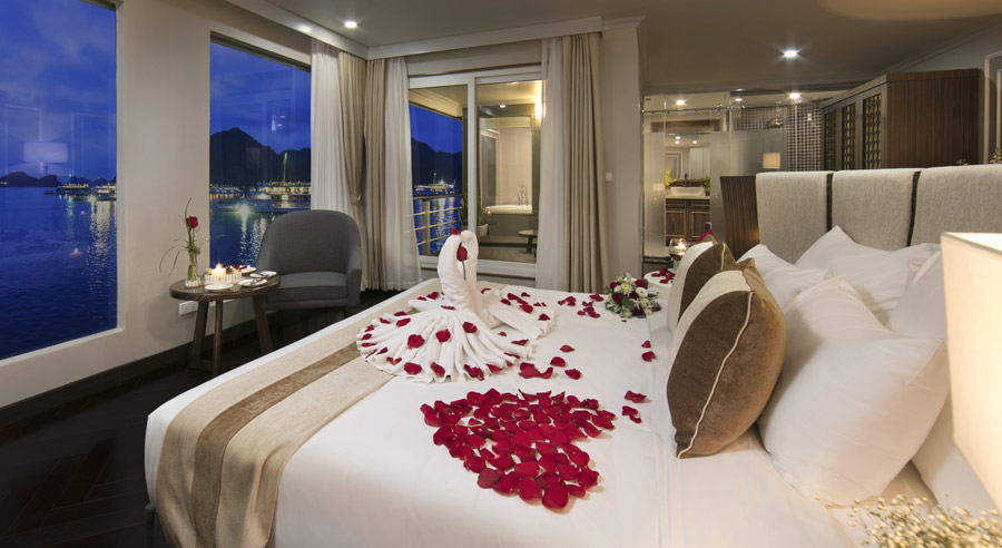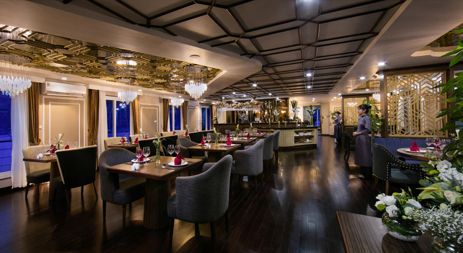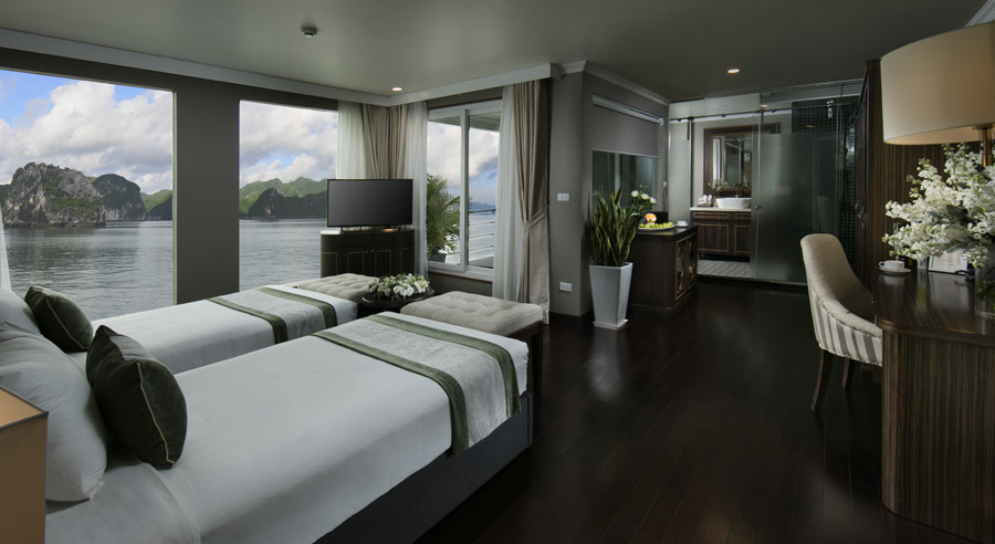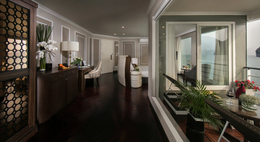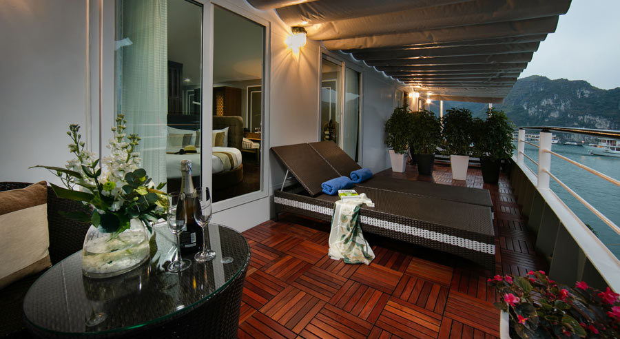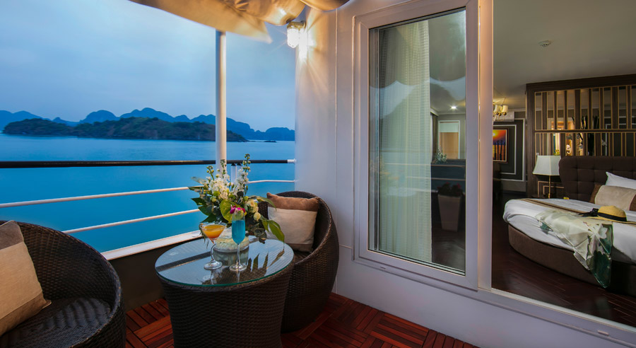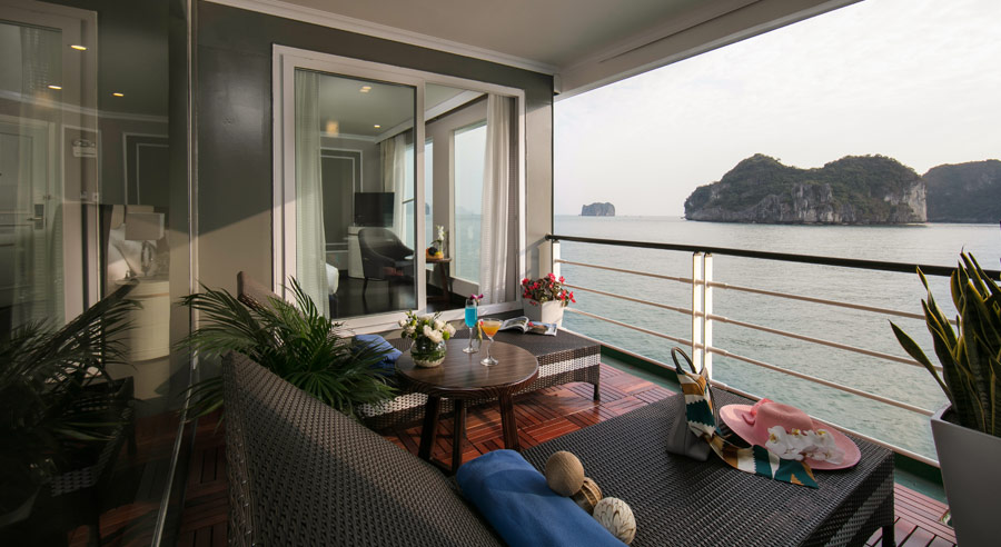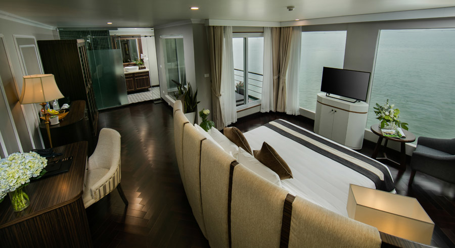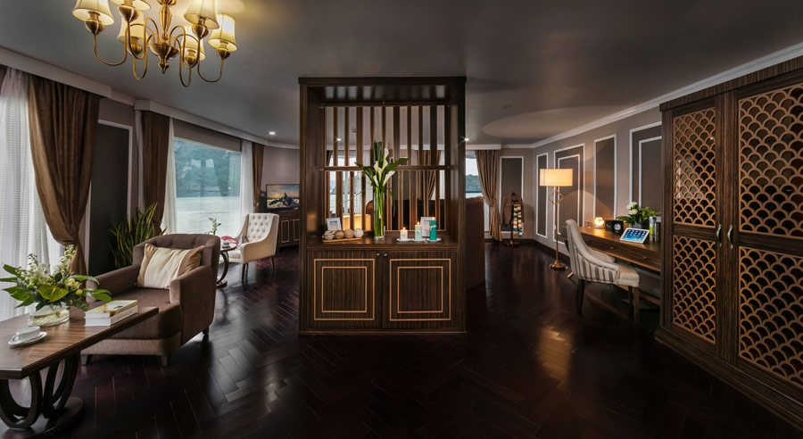 All cabins are elegantly decorated and come with a private sun terrace, generous living space, and premium amenities. Notably, the Era Suite, measuring 74 sqm, is one of the largest suites available among Halong Bay cruises, offering exceptional comfort and panoramic views.