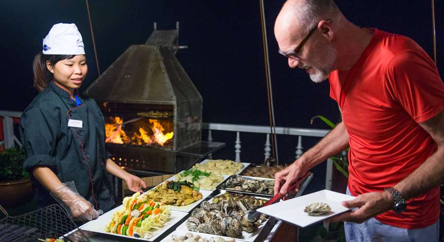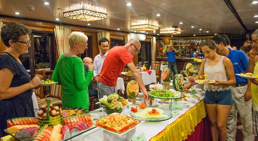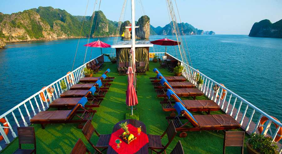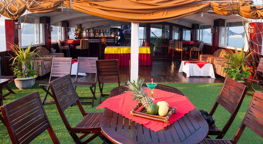 On board, guests can relax at the indoor and outdoor bars, savoring exquisite food and beverages, or unwind on the green sundeck with a cocktail while taking in panoramic bay views. With a professionally trained crew delivering attentive service throughout the journey, Gray Line Cruise Halong Bay promises a memorable and well-rounded experience—carefully selected and recommended by Vietnam Booking Center.