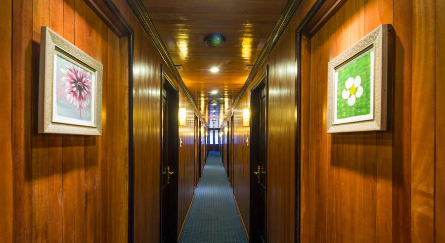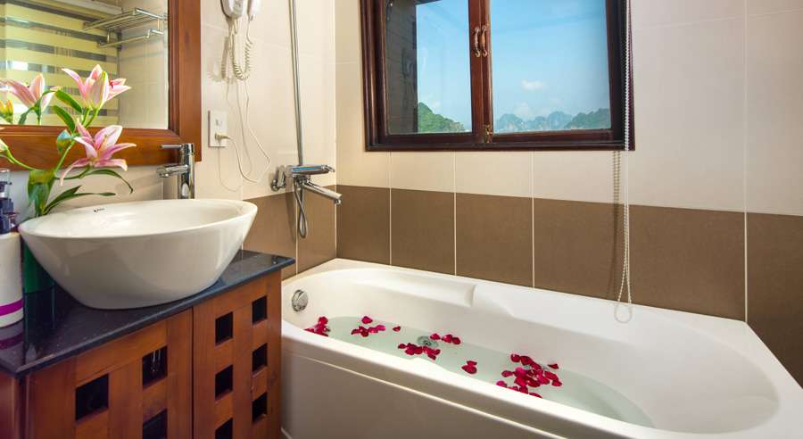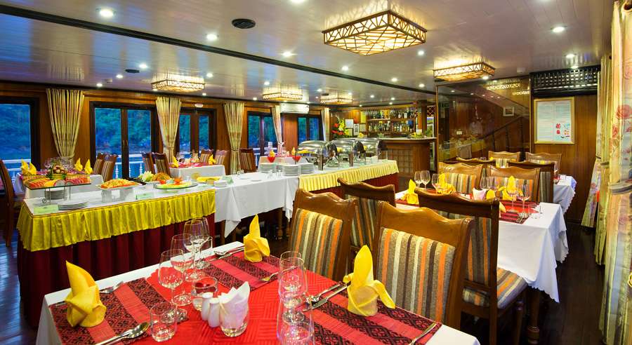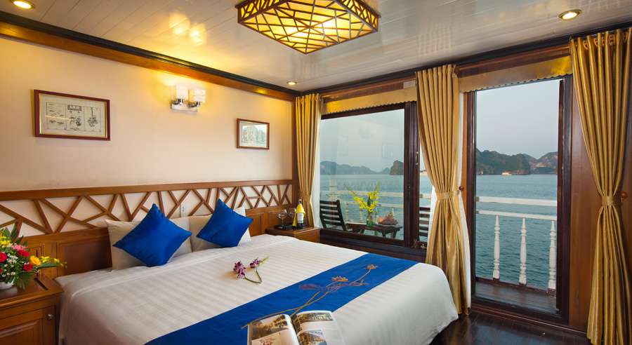 The cruise features 14 well-equipped cabins with elegant oak wooden interiors, designed to create a warm and refined atmosphere. All cabins offer either large sea-view windows or private balconies, allowing guests to fully enjoy the emerald waters of Halong Bay. Accommodation options include Deluxe Cabins on the first deck, Deluxe Balcony Cabins on the second deck, and an exclusive VIP Suite with a private terrace.