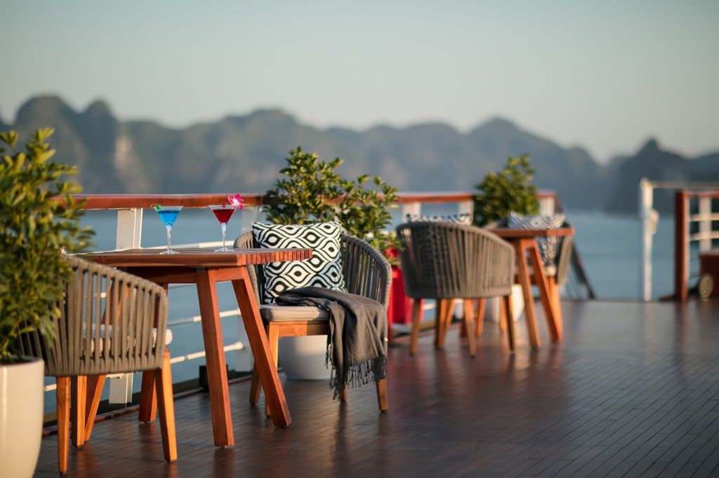 The cruise proudly embraces Indochine-inspired architecture while highlighting Vietnam’s rich cultural heritage. To maximize natural light and the connection with the sea, the ship features arched staircases, floor-to-ceiling windows, and wide private balconies overlooking the bay. Every cabin includes a spacious bathroom with large glass panels offering panoramic views of Lan Ha’s green limestone landscape.