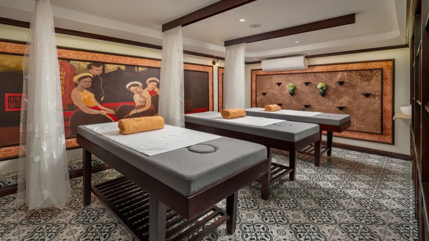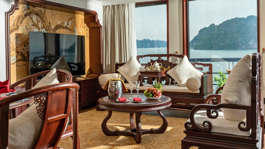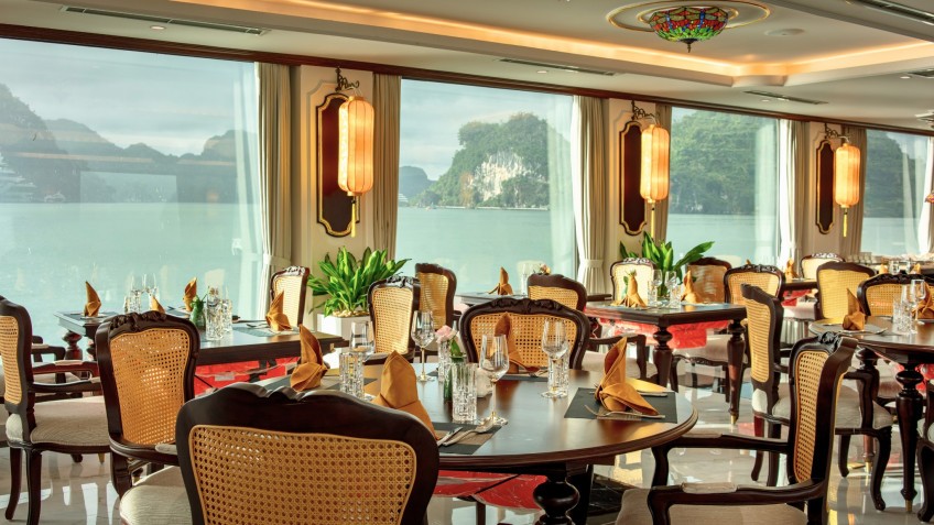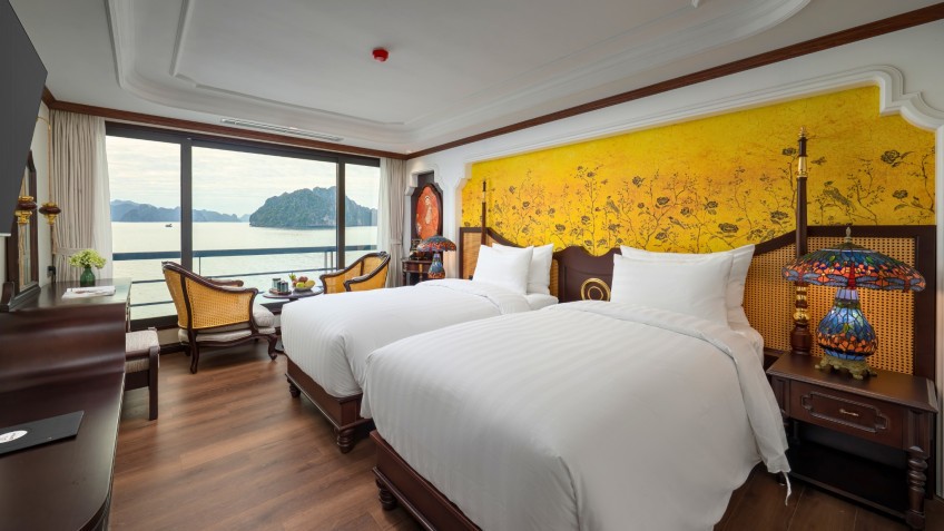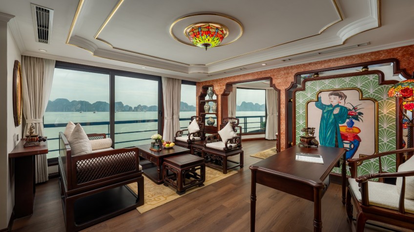 On board, guests can enjoy top-tier facilities including a 45m² four-season swimming pool, Lotus Spa & Sauna, spacious sundecks, and elegant restaurants. Carefully designed itineraries allow travelers to explore iconic destinations such as Sung Sot Cave, Titop Island, Luon Cave, and extended routes to Lan Ha Bay and Ba Trai Dao Beach.