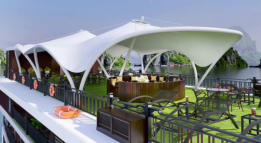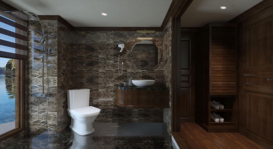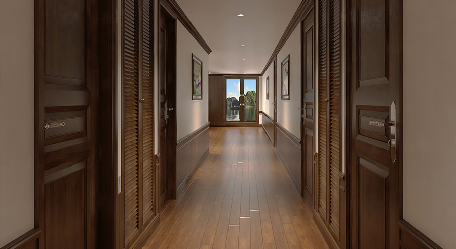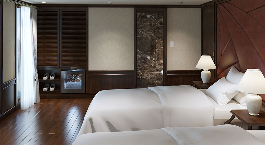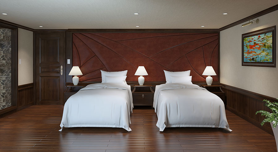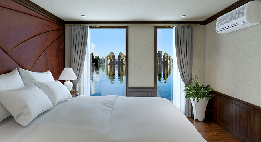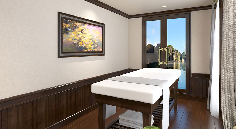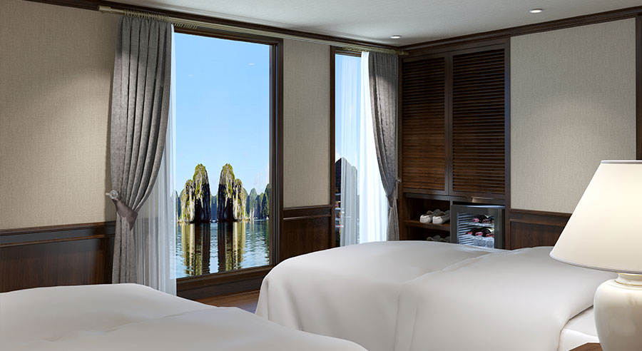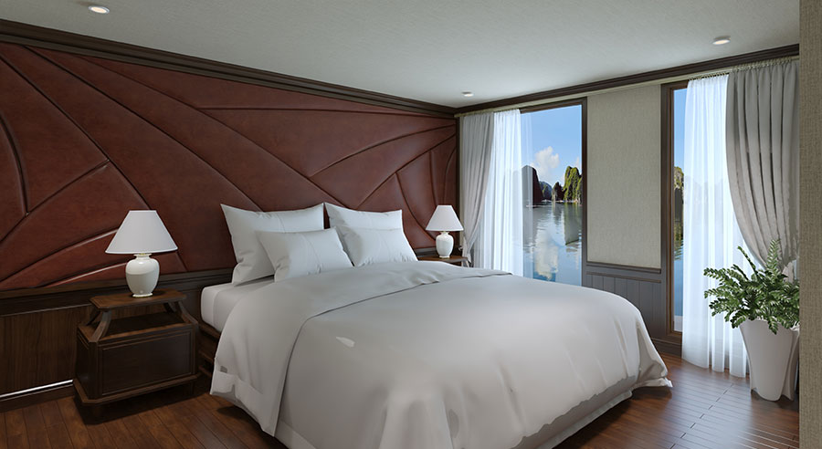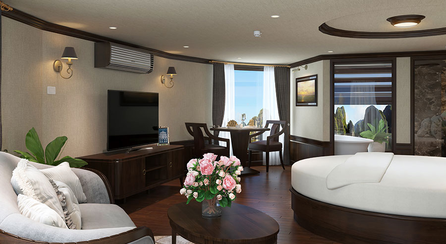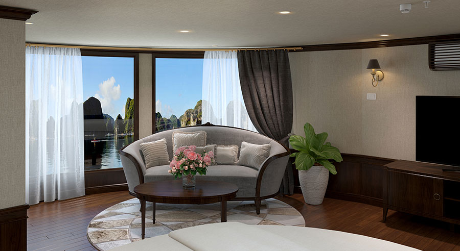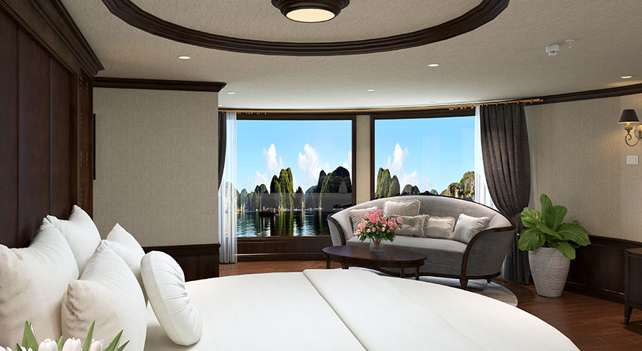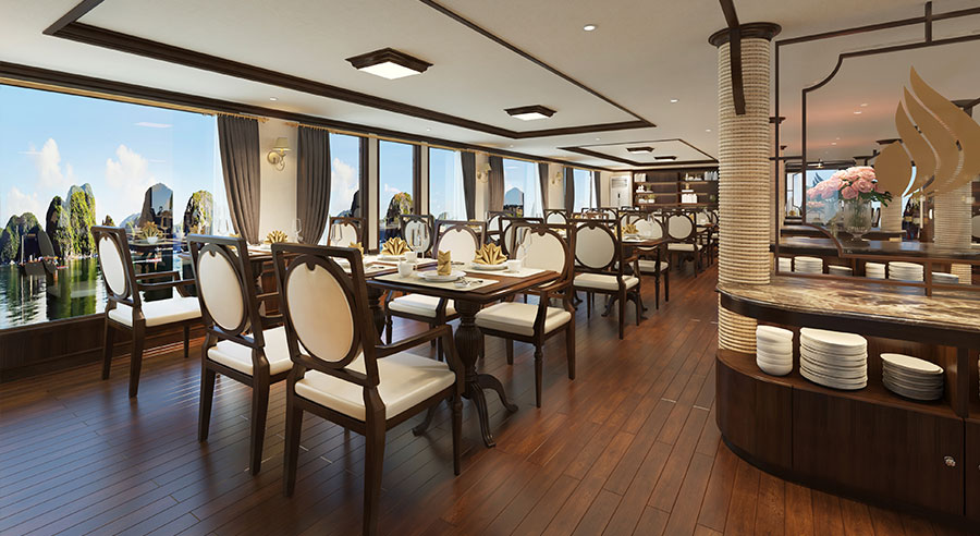 Each cabin is well-appointed with premium amenities, complimentary mineral water and fresh fruits, and a comfortable en-suite bathroom. After a day of exploration, guests can unwind at the spa, relax on the expansive sundeck, or enjoy a romantic dining experience at the onboard restaurant, which serves a diverse selection of refined Vietnamese and international cuisine.