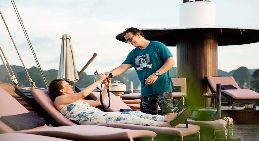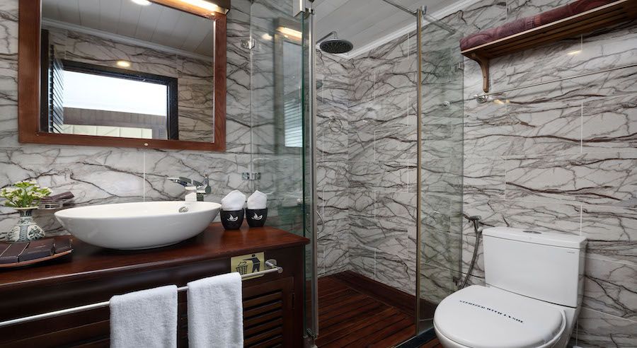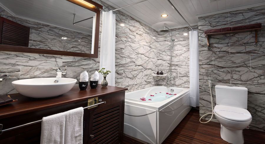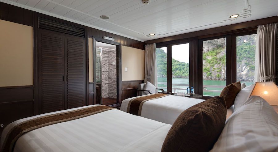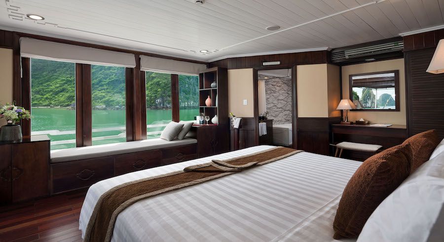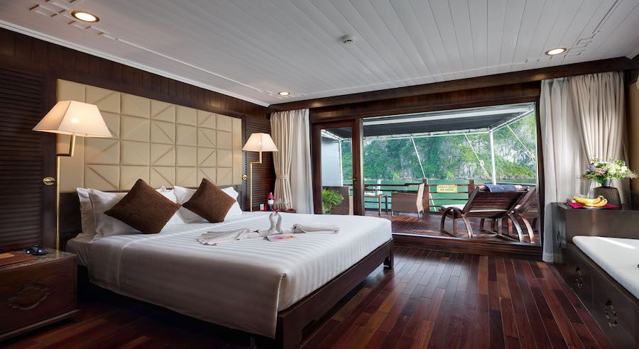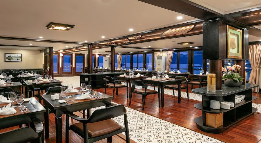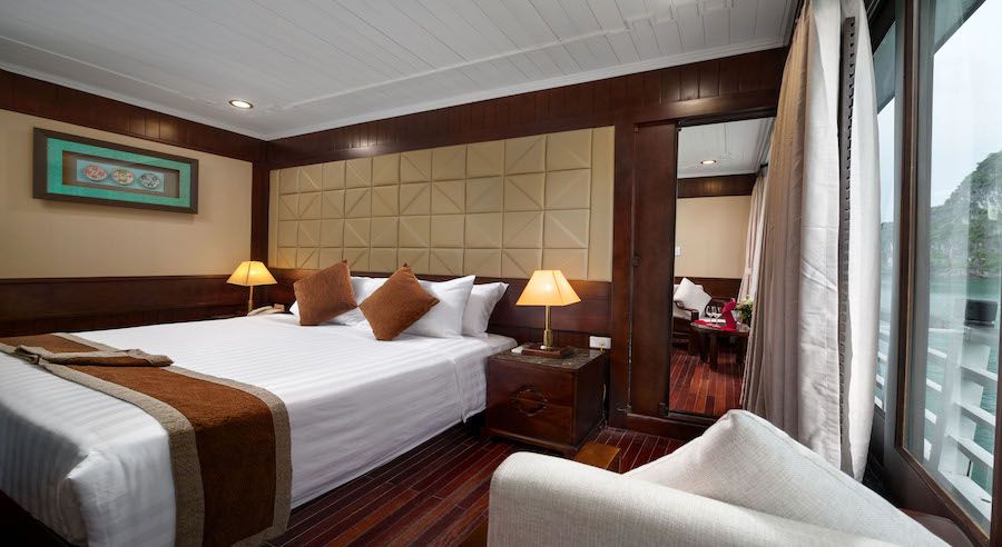 The cruise accommodates 11 deluxe cabins and 6 suites, with 4 combinable deluxe rooms that can be converted into spacious family cabins. The décor blends modern comfort with a tasteful touch, while the large sundeck offers the perfect setting for sunbathing or simply admiring the breathtaking limestone scenery of Halong Bay.