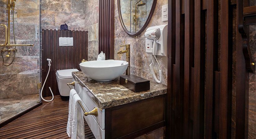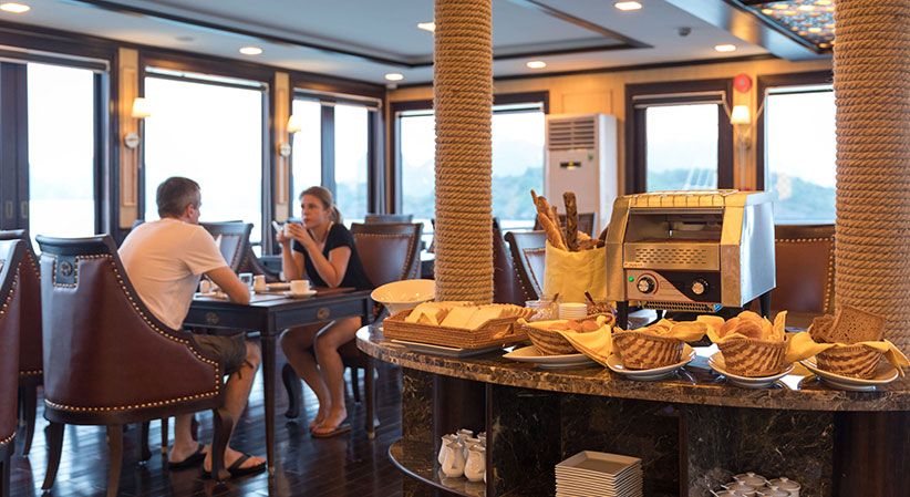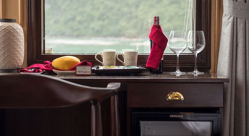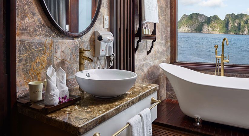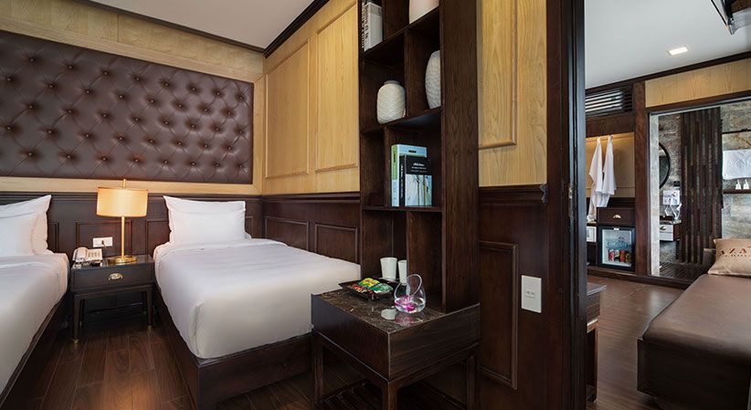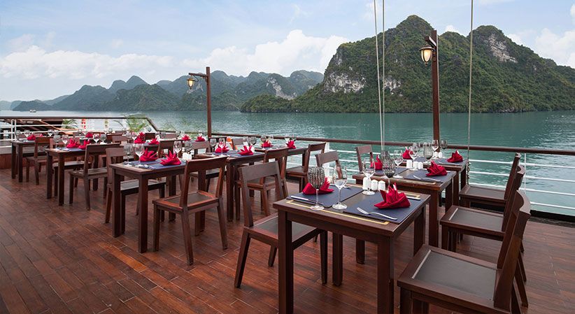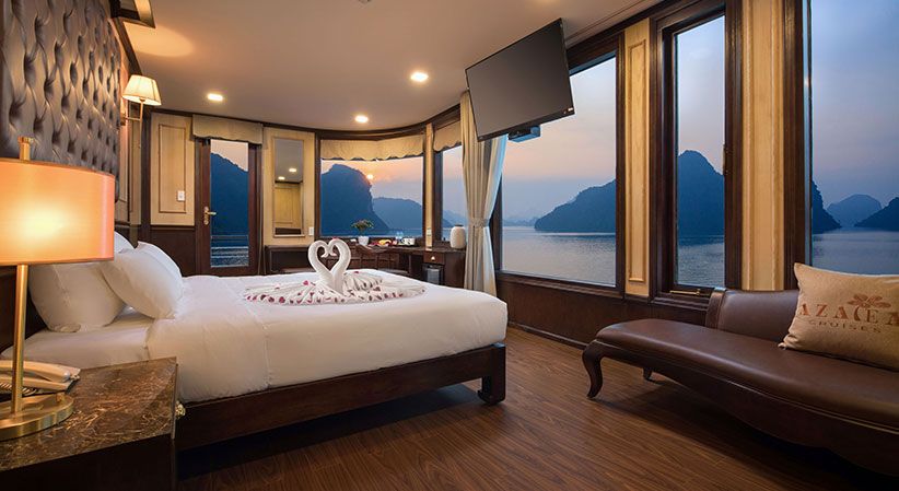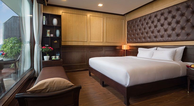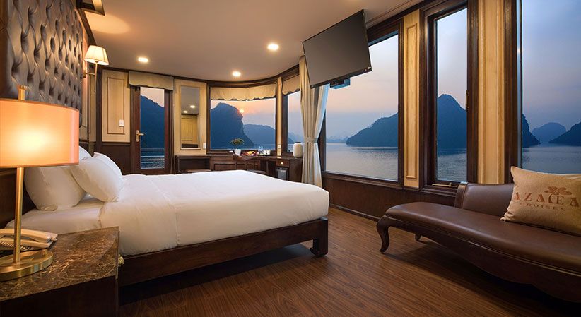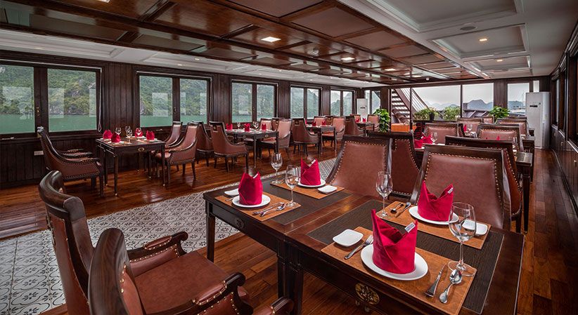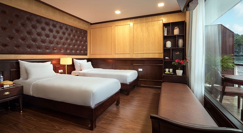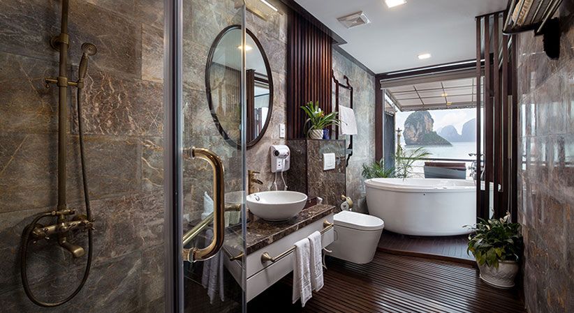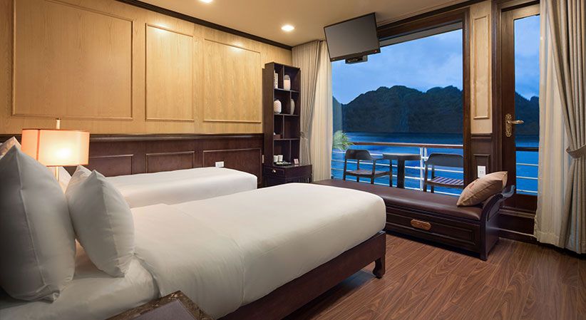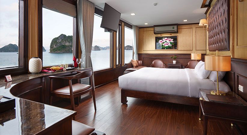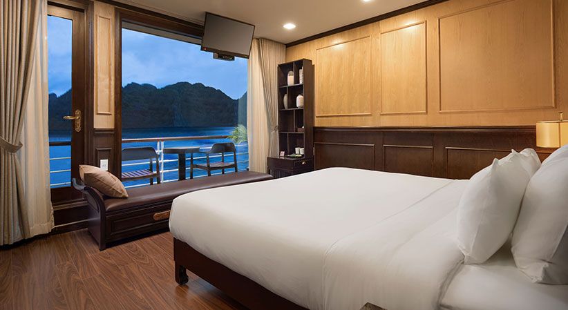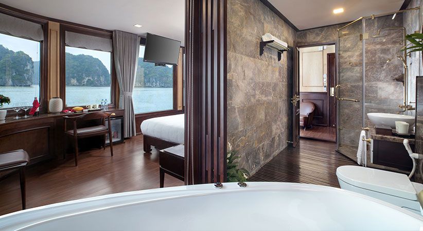 All cabins are generously sized and come with open private balconies, giving guests uninterrupted views of the bay. Each room is equipped with luxury bathroom amenities, ensuring both comfort and elegance throughout the trip. The cruise also benefits from a short travel distance—only about 2 hours from Hanoi and 30 minutes from Hai Phong Airport—making it a convenient option for both domestic and international travelers.