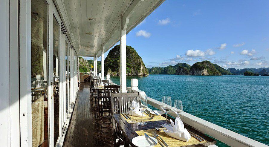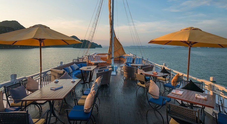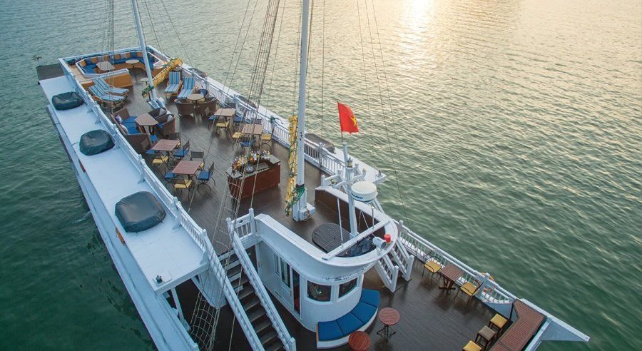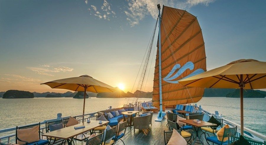 The cruise features 17 cabins divided into three categories: Superior, Deluxe, and Suite. Each cabin is designed with attention to detail and fitted with modern amenities such as central air-conditioning, an en-suite bathroom, and a private balcony. Guests will enjoy plush, soft beds and wide open views overlooking the majestic limestone formations of Halong Bay.