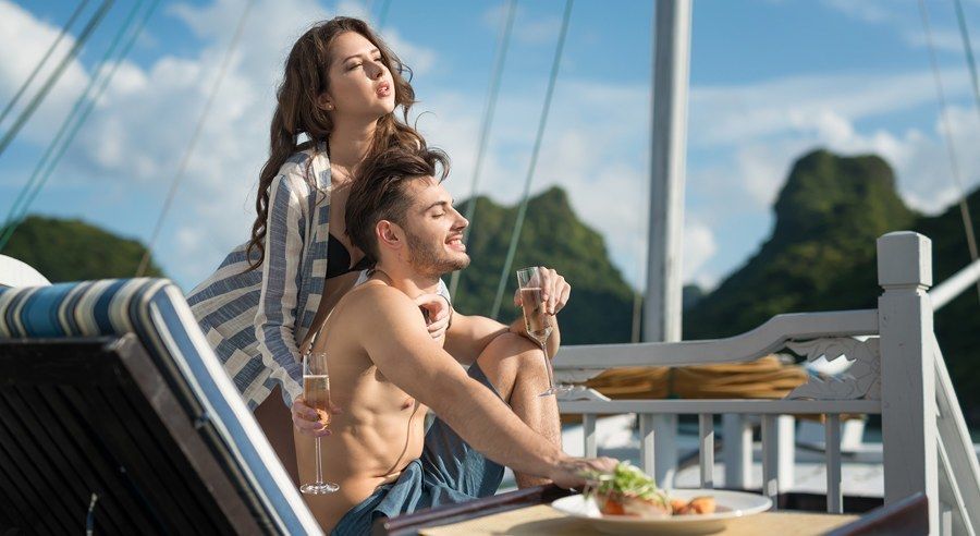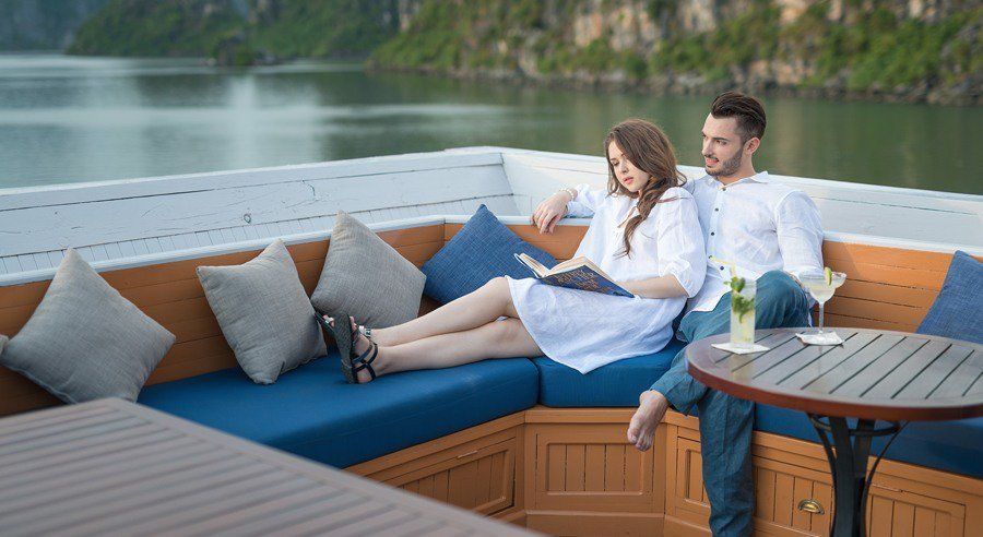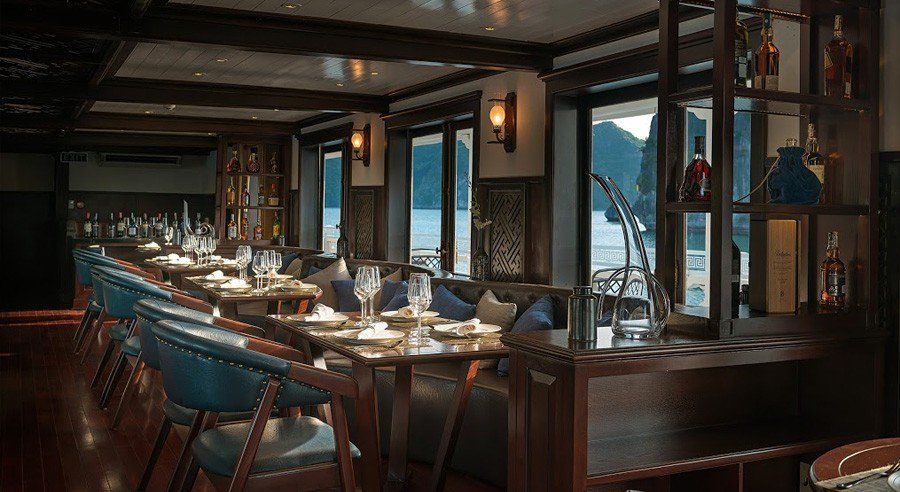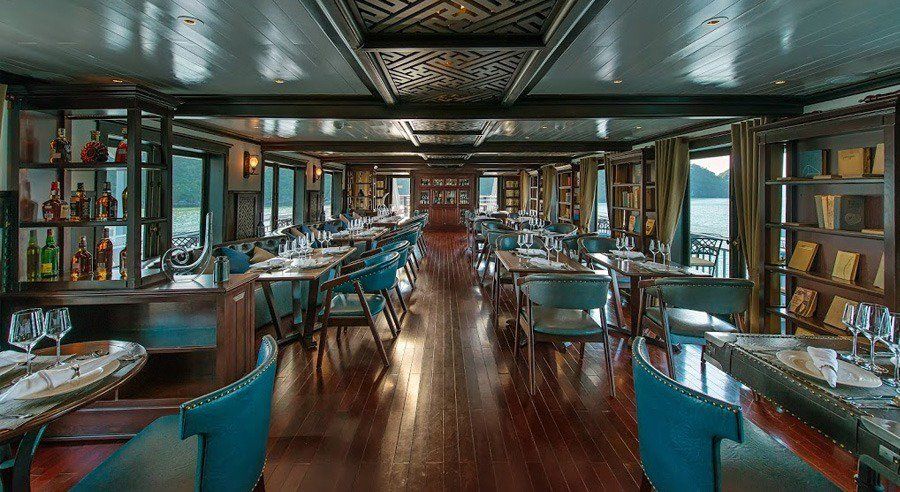 Paradise Cruise is instantly recognizable on the emerald waters of Halong Bay thanks to its elegant blend of bright tones and luxurious materials. The combination of dark precious wood, creamy silk, crisp white linen, sea-blue taffeta, fine-textured marble, and delicate china and silver details gives the ship a graceful, upscale ambiance from bow to stern.