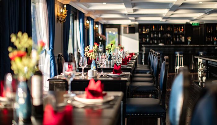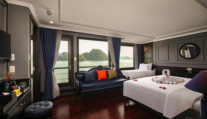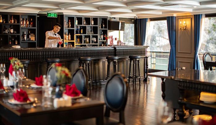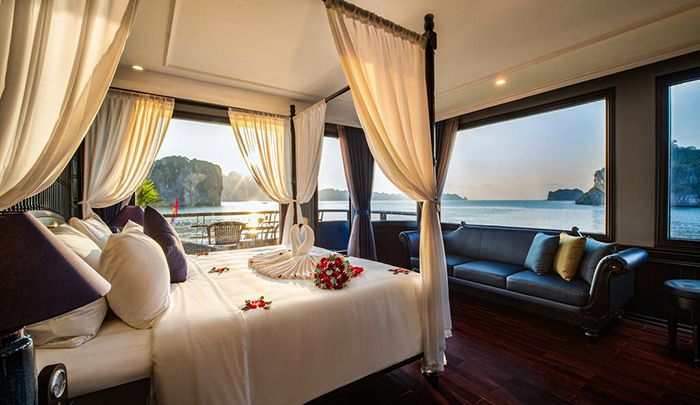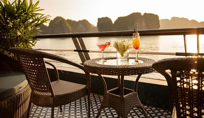 Rosy’s private restaurant serves all-day dining, with an exceptional multi-course dinner showcasing Vietnamese and international delicacies prepared by skilled chefs. The top sundeck captures sweeping views of the emerald bay, ideal for sunbathing in the morning or enjoying the starlit sky at night. Additional onboard comforts include a pampering spa, a fitness area, and a small library.
