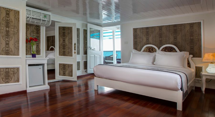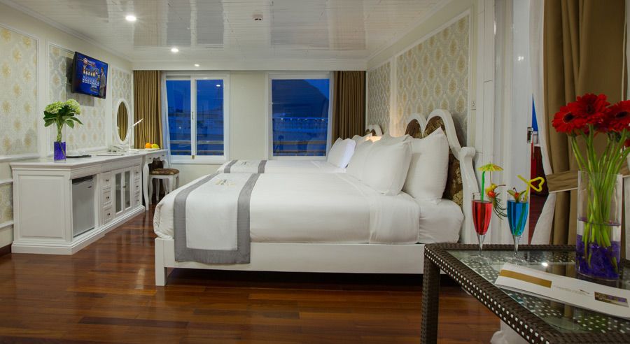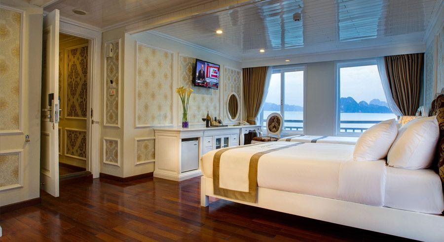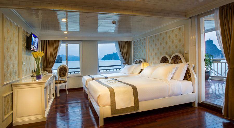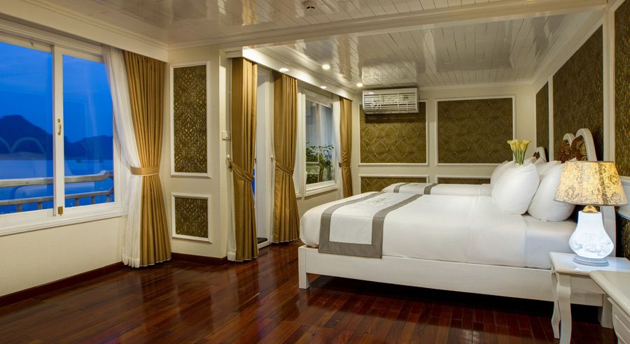 Hailed as one of the biggest cruises in Halong Bay, Royal Signature Cruise features four decks instead of the usual three. The layout includes the Lower Deck (320m²), Middle Deck (300m²), Top Deck (290m²), and the Rooftop Sun Terrace (180m²). A total of 16 cabins are categorized into Junior Suite, Senior Suite, Exclusive Family Suite, Elite Family Suite, and Royal Suite. Cabin sizes range from 28 to 82m² and comfortably accommodate 2–4 adults and 1–2 children under 12, making Royal Signature Cruise an excellent choice for families or groups seeking a spacious and relaxing voyage.