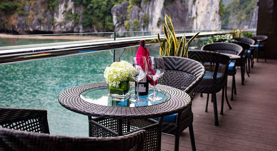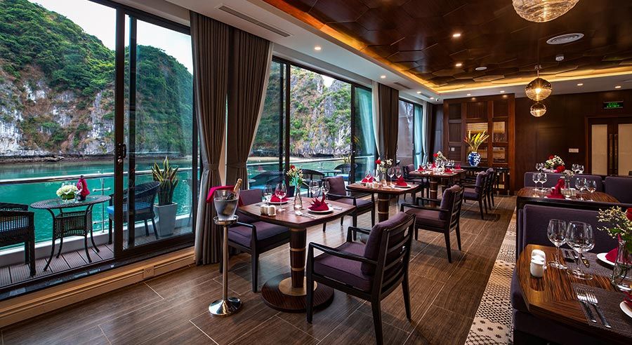 The dining restaurant—located on the third deck—accommodates up to 60 guests, offering both indoor and outdoor seating. Designed in a romantic, elegant style, it delivers a 5-star culinary journey with beautifully crafted Vietnamese and international dishes.