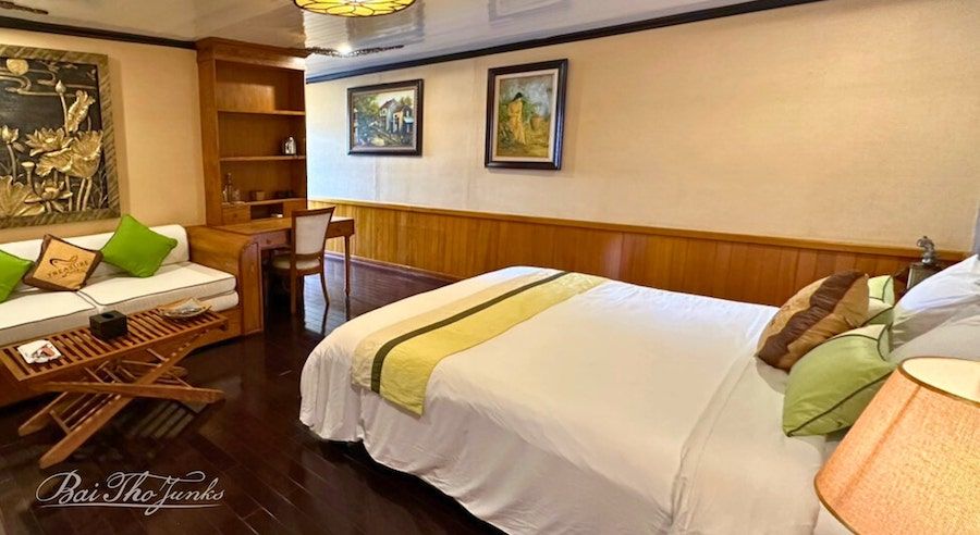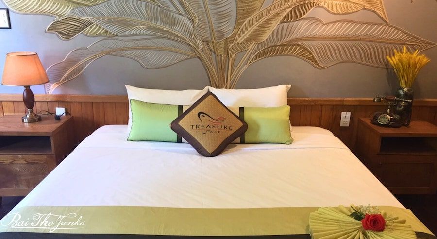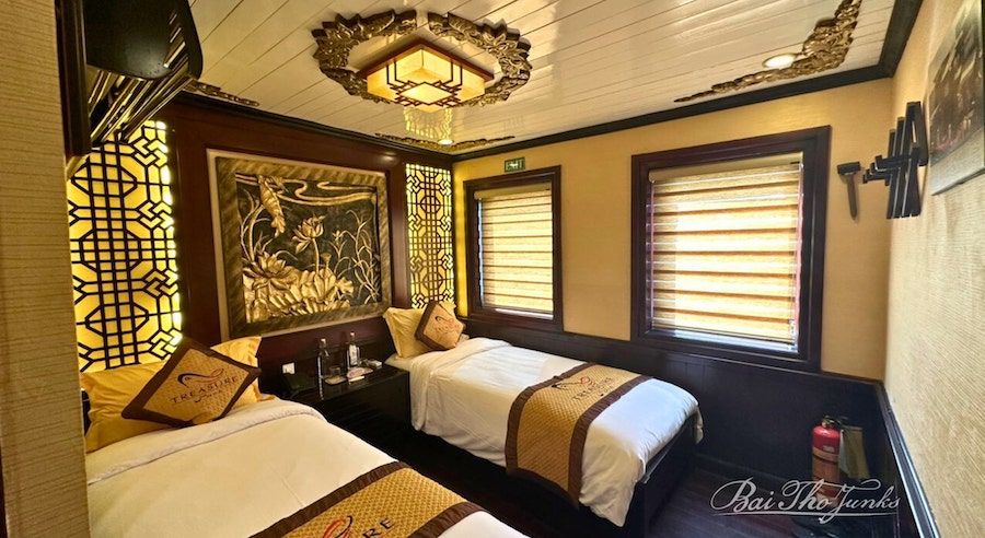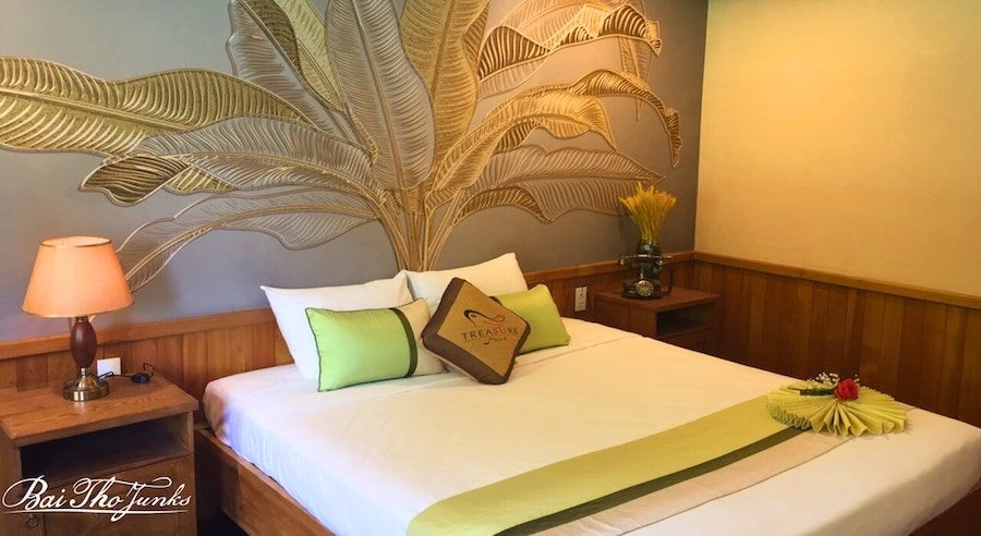Treasure Junk is a charming boutique boat offering a refreshing and less-traveled journey through the peaceful waters of Bai Tu Long Bay. With 14 cozy cabins, each featuring ocean-view windows and essential amenities, the cruise ensures a comfortable stay for every guest. For those who value extra privacy, the two upper-deck suites come with private balconies—perfect for quiet moments with your loved one.