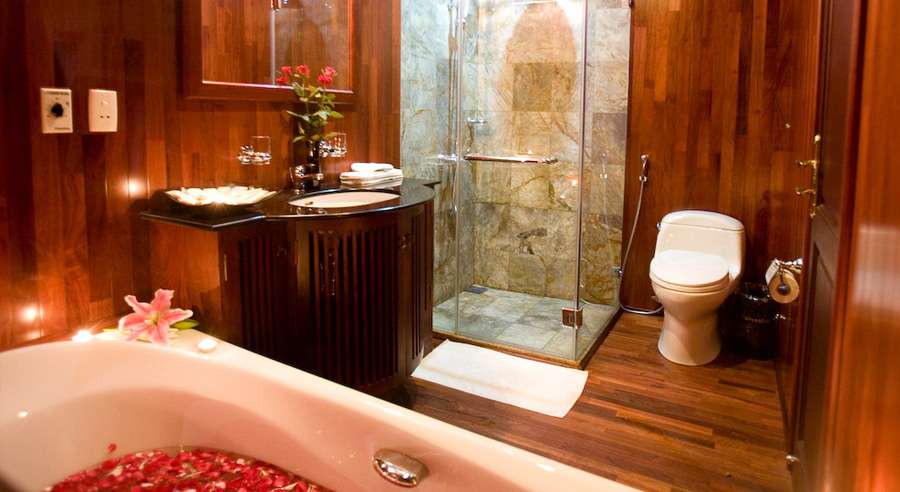 Valentine Cruise features 4 Deluxe cabins and 1 Suite, with spacious sizes ranging from 19 to 30 square meters. Each cabin is elegantly decorated with high-quality wooden interiors and equipped with modern amenities. All bathrooms are private and include both standing showers and bathtubs, providing one of the most luxurious bathroom facilities among small cruises in Halong Bay.