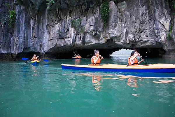 Cruise heads to Luon Cave. In this area, it’s time for you to heat up with kayaking (about 30 minutes kayaking) or enjoying the beautiful scenery at Hang Luong ( Creepy Cave ) with the Rowboat – which is rowed by the local people in Ha Long Bay.