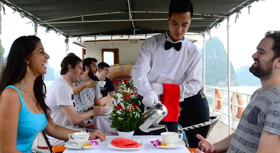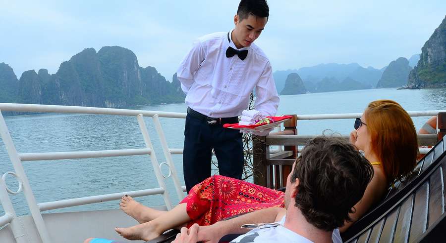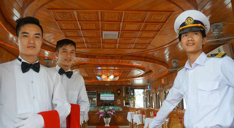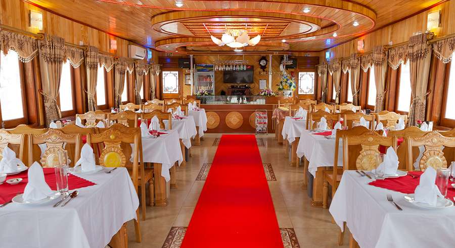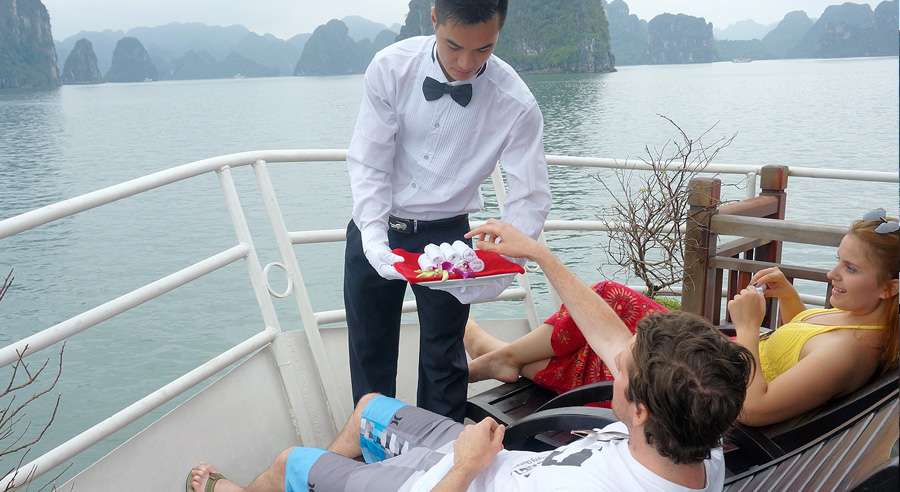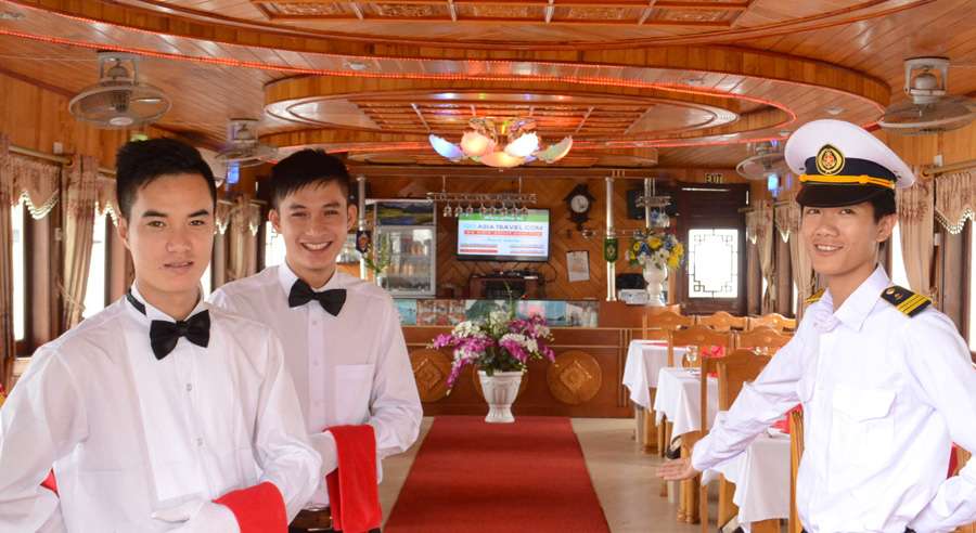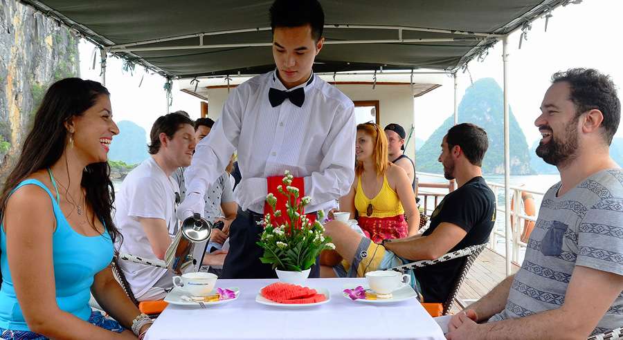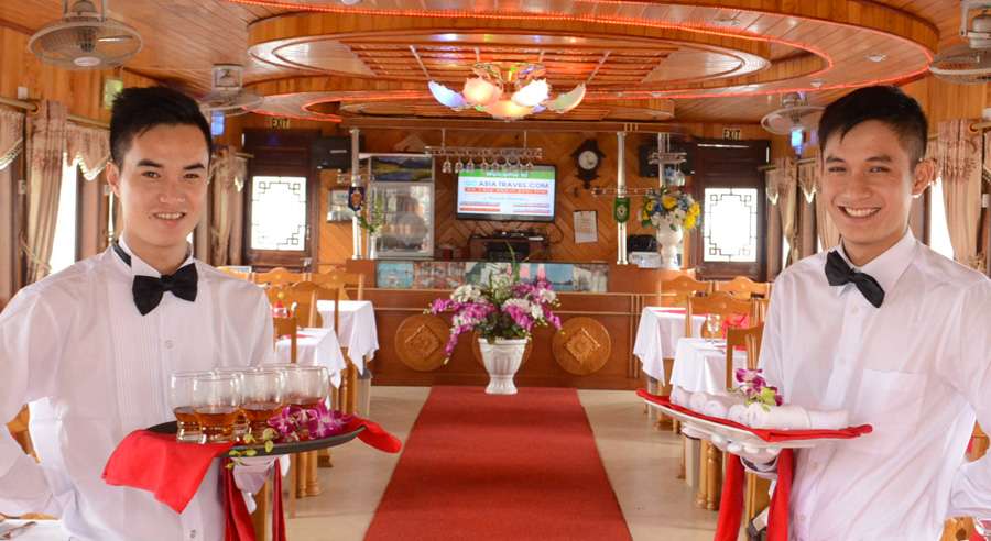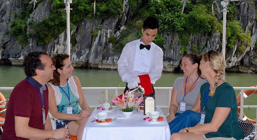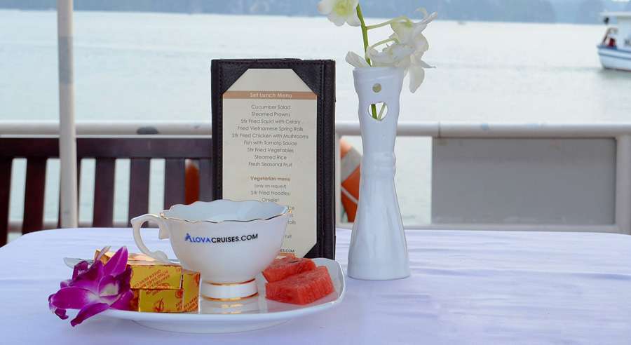 The standard Alova Day Cruise itinerary runs from 07:45 AM, with hotel pick-up by shuttle bus, until approximately 08:30 PM when guests are dropped off. The cruising time on Ha Long Bay is from 12:30 PM to 04:30 PM, allowing ample time to relax, admire the landscape, and enjoy a memorable day exploring one of Vietnam’s most celebrated natural wonders.