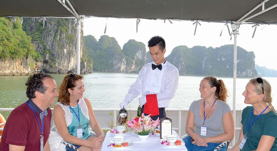 Discover the UNESCO World Heritage Site of Ha Long Bay aboard the charming Alova Cruise. Glide through emerald waters while enjoying a peaceful moment with a cup of tea, surrounded by the bay’s iconic limestone formations and serene scenery.