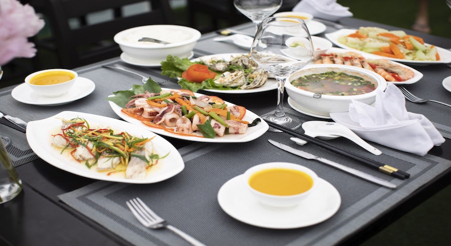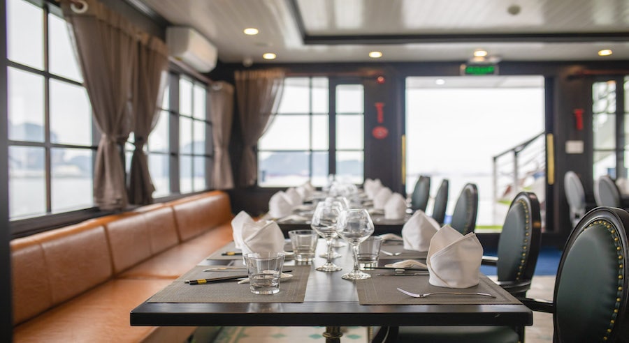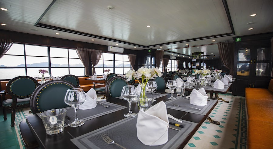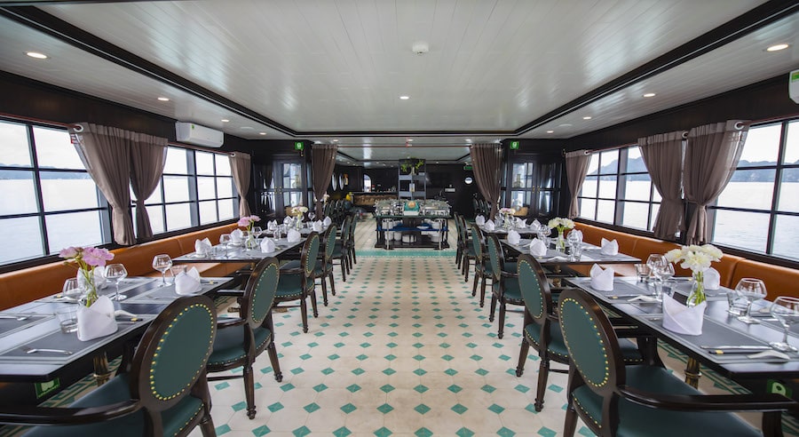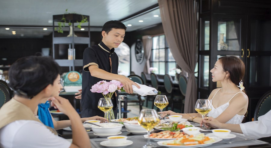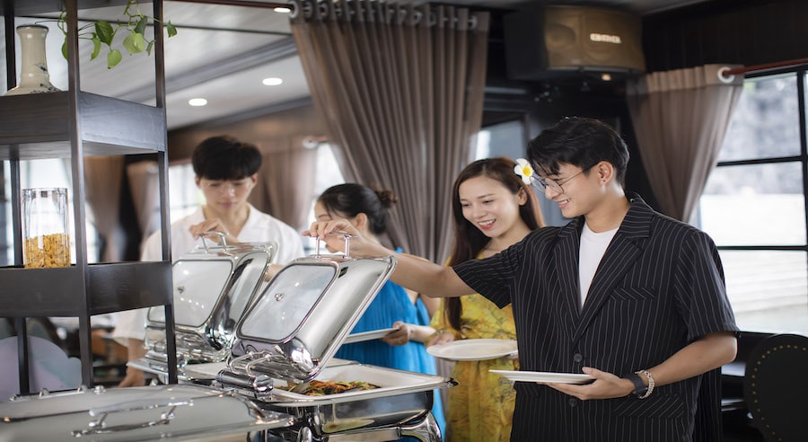 A buffet lunch featuring fresh seafood and Vietnamese specialties is served during the cruise. Special dietary requests are available upon prior notice. Additional beverages such as wine, beer, and cocktails can be ordered at the bar.